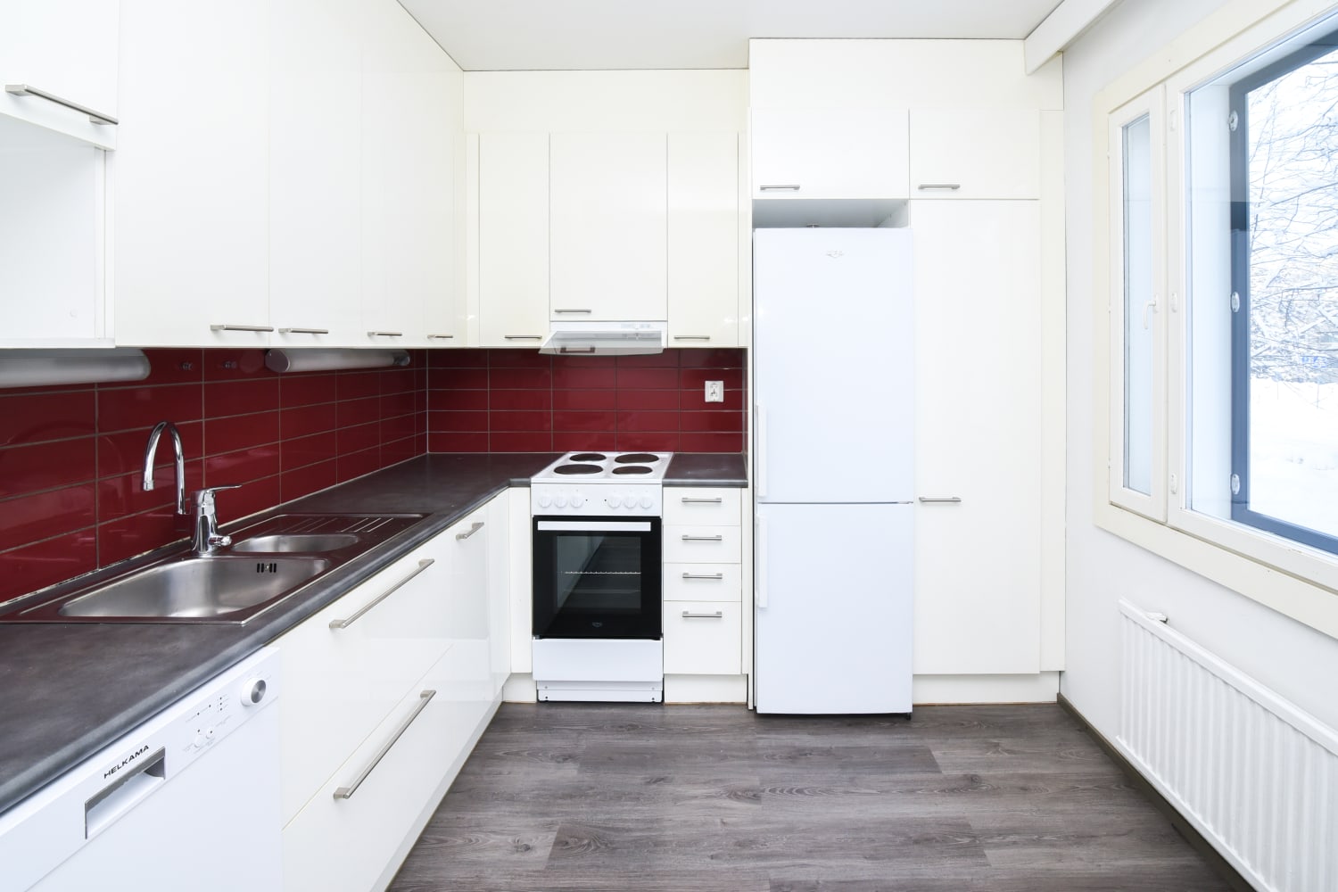 The homes in sections A - C are particularly special: The materials used to decorate these splendidly renovated homes differ from the traditional pale Finnish colour scheme. The non-wet room floors are dark grey laminate, and the white kitchen units are contrasted by burgundy backsplash tiles. The bathroom walls are tiled in a rich yellow ochre, while the floors have black hexagon tiles for a retro look.