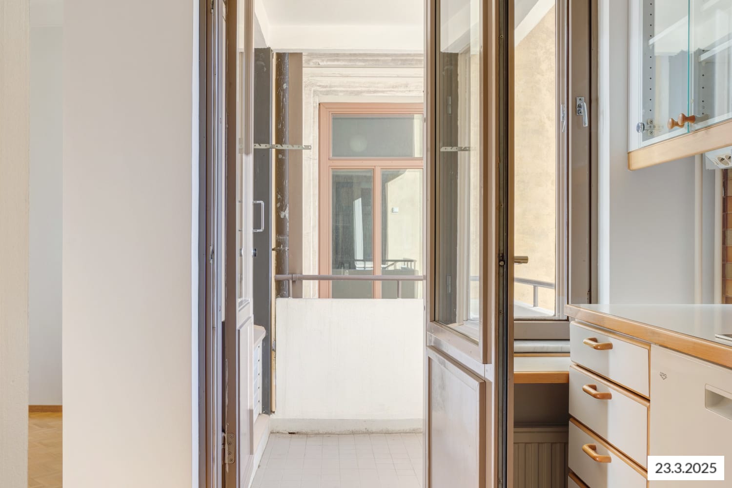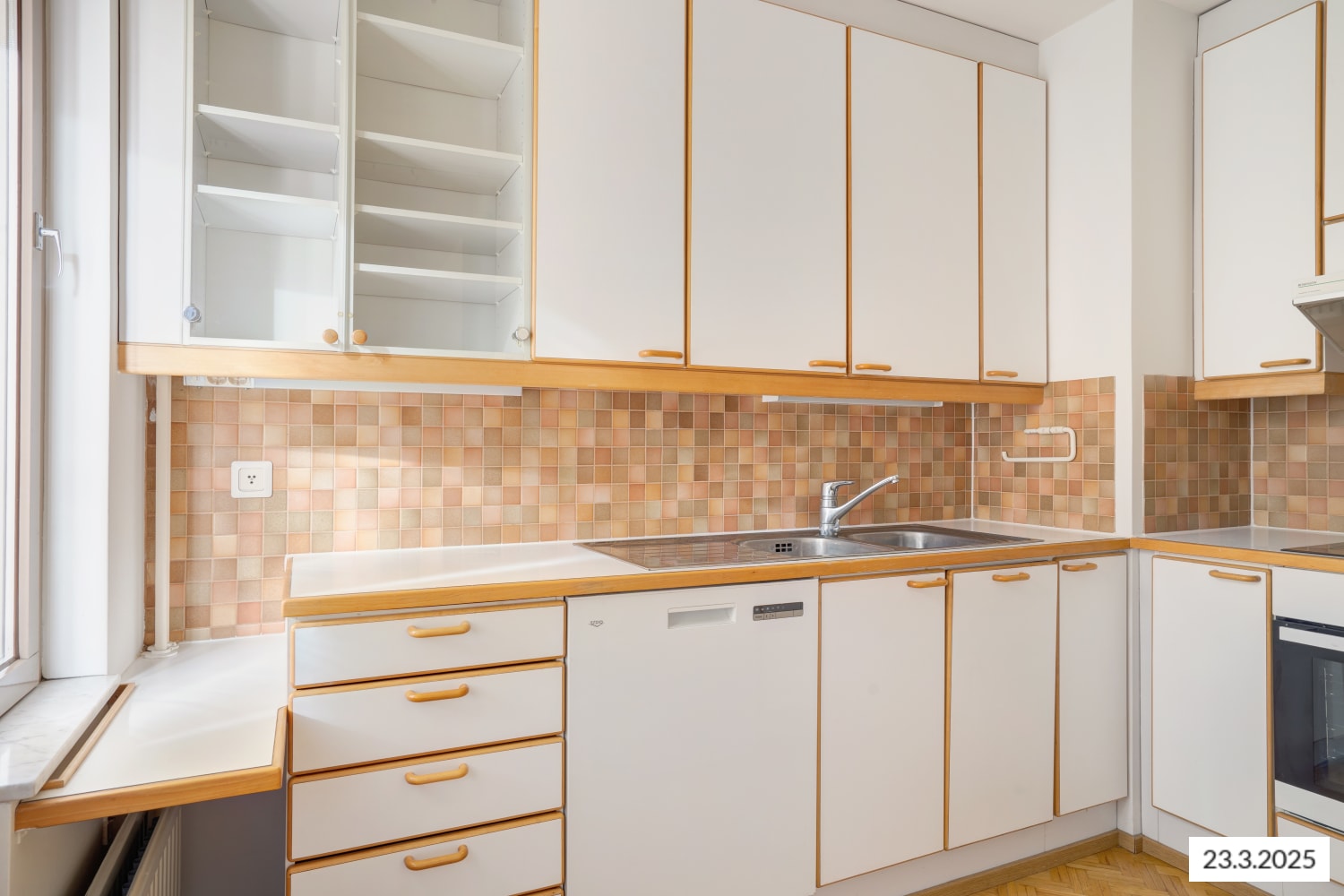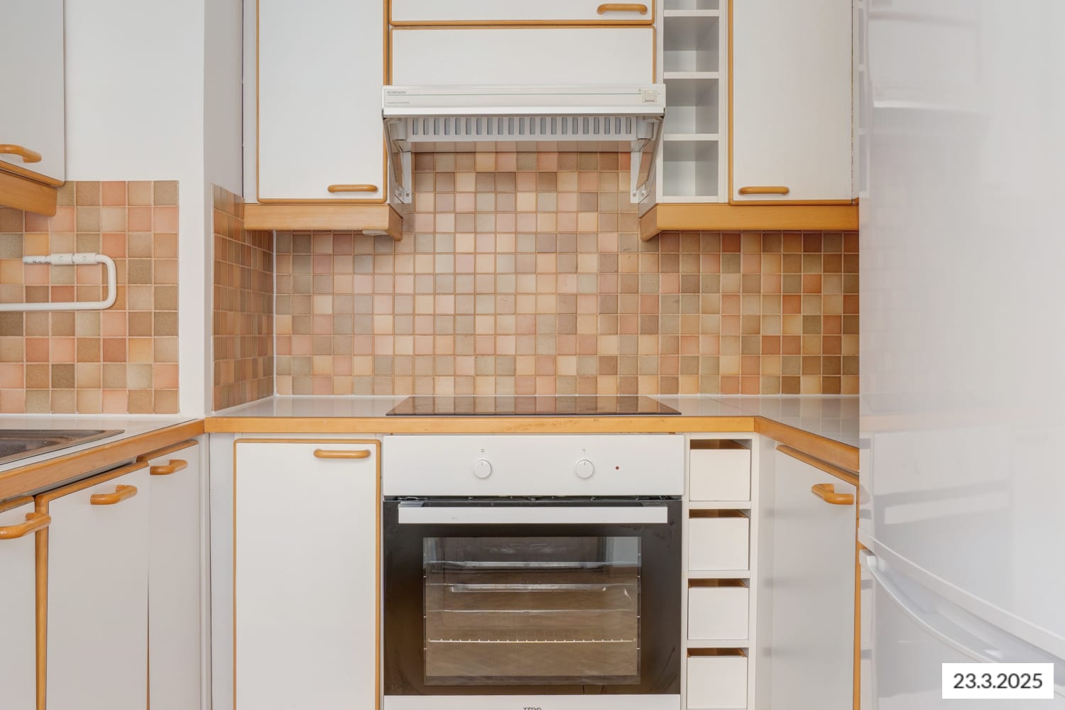 This charming small home features stunning herringbone parquet that starts at the entrance and continues throughout the apartment. The kitchen is slightly separated from the living area, with storage spaces concentrated behind a partition wall in the entrance hall. The kitchen is equipped with a dishwasher, ceramic hob, and freezer-refrigerator.