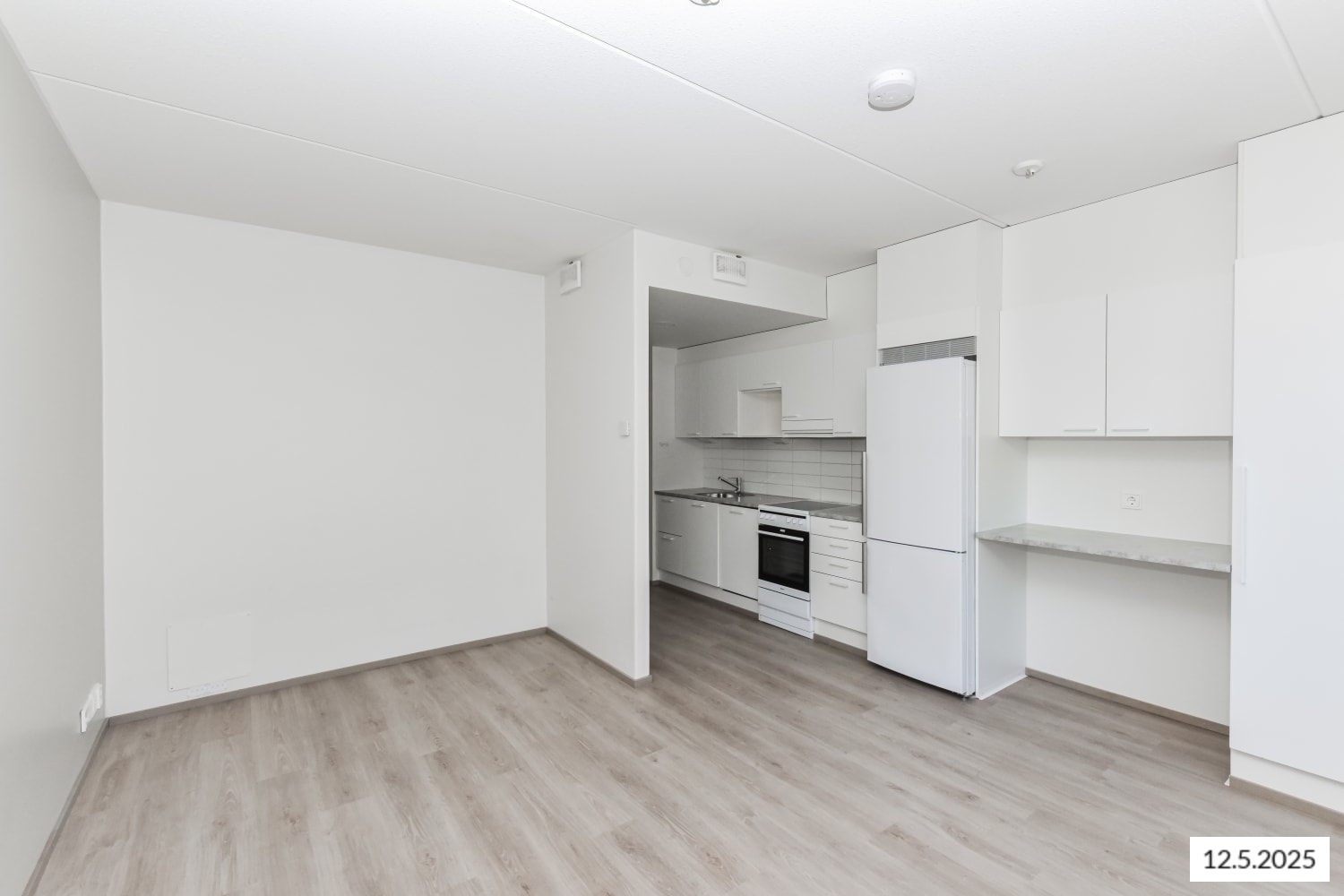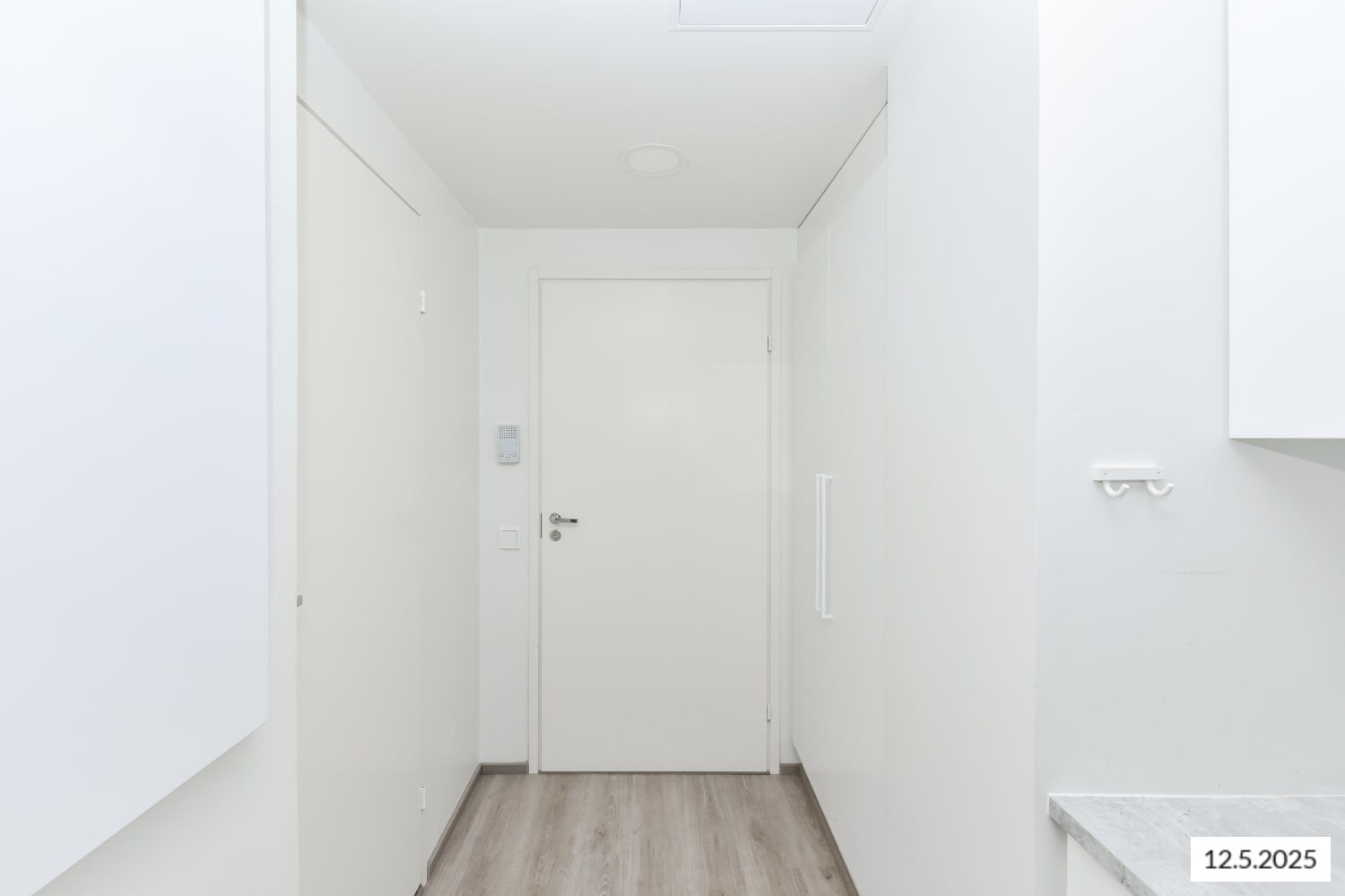 The floors in the living areas are laminate resembling oak planks, subtly light grey in colour. The white-painted walls are enlivened by an accent wall in a muted grey tone that complements the colour of the floor laminate beautifully. The kitchen cabinet doors are fresh white, with the space between upper and lower cabinets tiled with glossy white tiles. The worktop is grey laminate. The kitchen is equipped with a ceramic hob, dishwasher, and freezer-refrigerator. In the bathroom, the walls are tiled in glossy white, with accent walls in grey. The floor tiles are neutral grey. There is provision for a washing machine and tumble dryer.