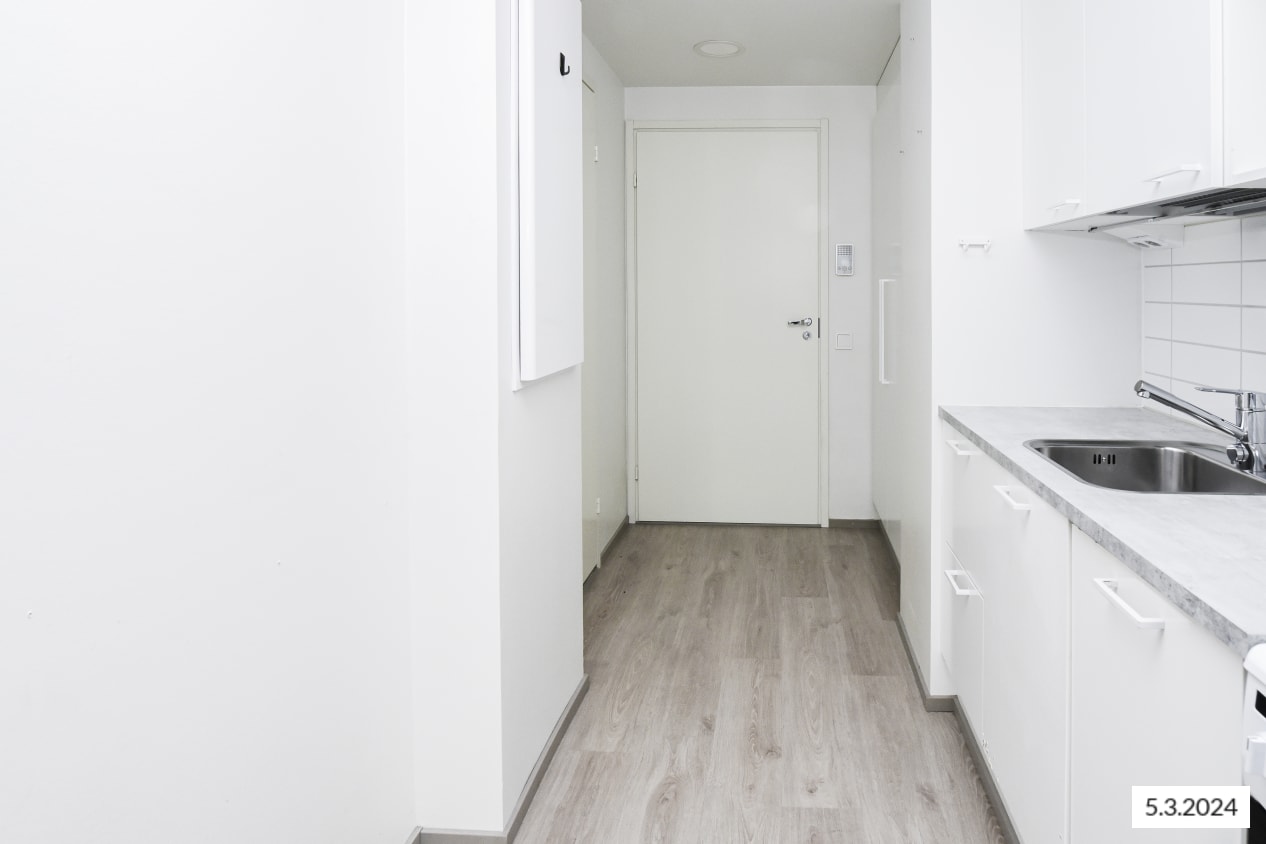 This beautiful, light-toned studio apartment is easy to decorate and make your own. The kitchen and living room merge into a spacious living area, and the alcove hidden by the hallway wall serves as a perfect resting space. The glazed balcony opening towards the courtyard is like an additional room that can be styled into a cosy summer retreat.