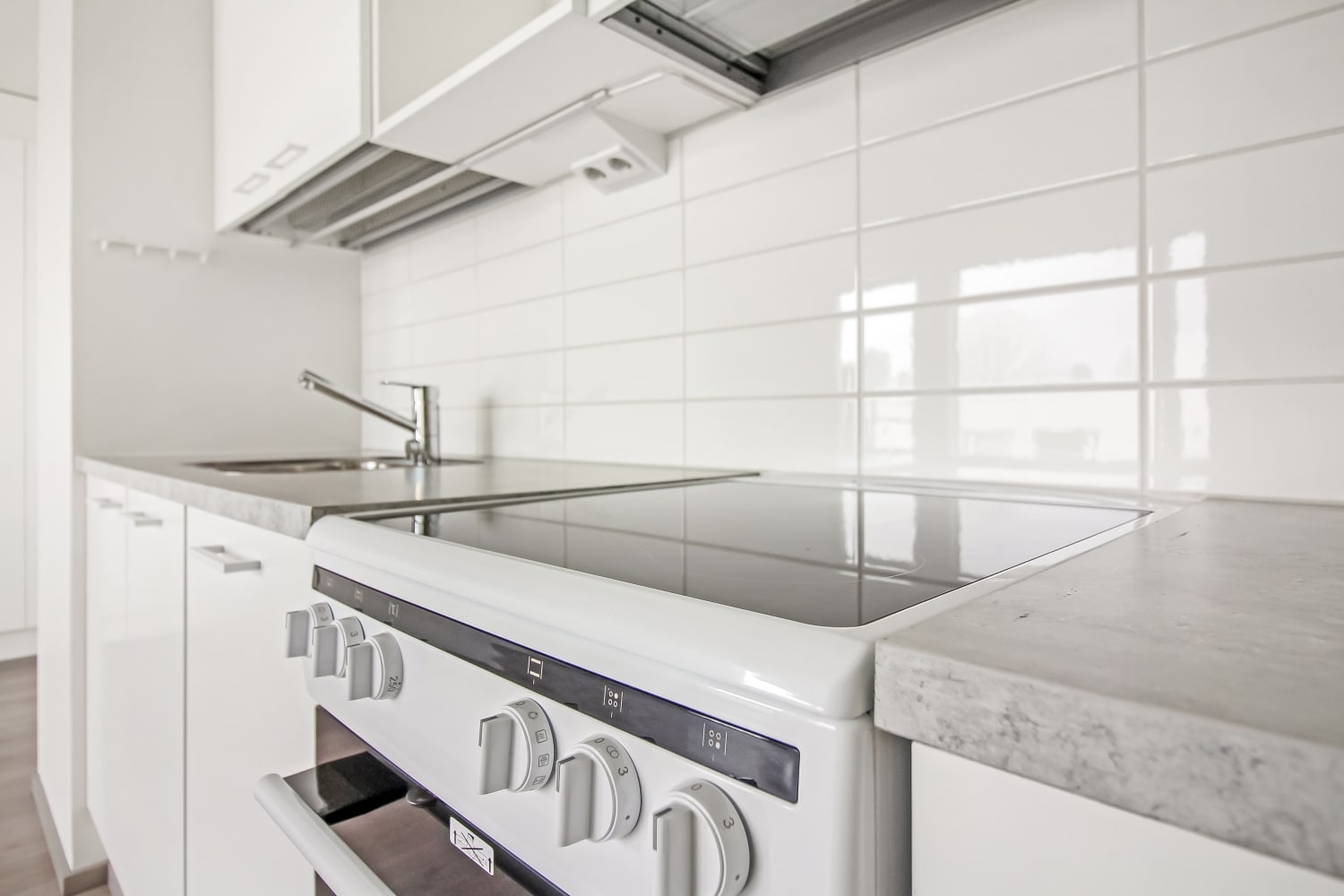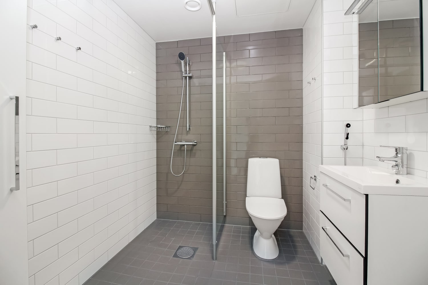 The living area floors are laminate, resembling oak planks in a subtle light gray shade. The white-painted walls are complemented by an accent wall in a muted gray tone that harmonizes beautifully with the flooring. The kitchen cabinets are fresh white, and the space between the upper and lower cabinets is tiled with glossy white tiles. The countertop is gray laminate. The kitchen is equipped with a ceramic stove, dishwasher, and cold appliances. The bathroom walls are glossy white tiles, with gray accent walls. The floor tiles are a neutral gray. There is space reserved for both a washing machine and a dryer.