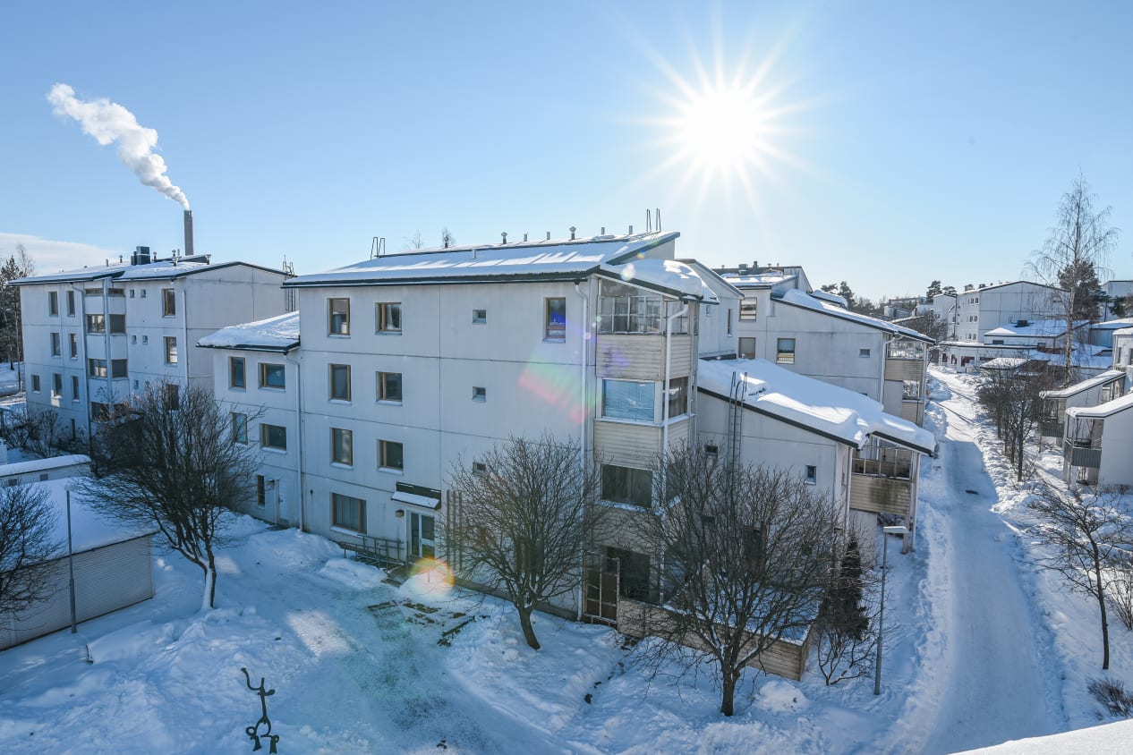 Located in a close-knit courtyard in the small house area of Kurkimäki, this top-floor apartment features a functional layout that is easy to furnish to your liking. The spacious glazed balcony opens southwest to a sheltered courtyard.