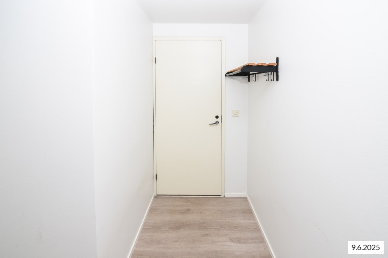 The walls of the home are painted white and the floors are light wood laminate.