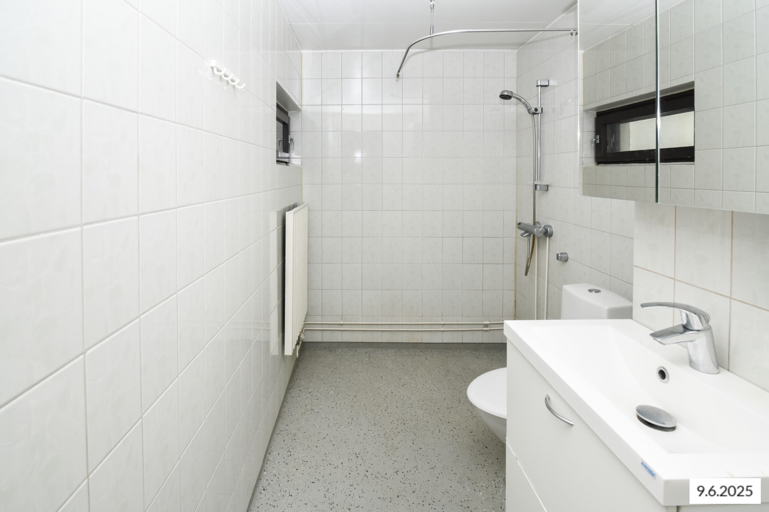 The bathroom walls are tiled, and the floor is easy-care resin flooring. The furnishings are white.