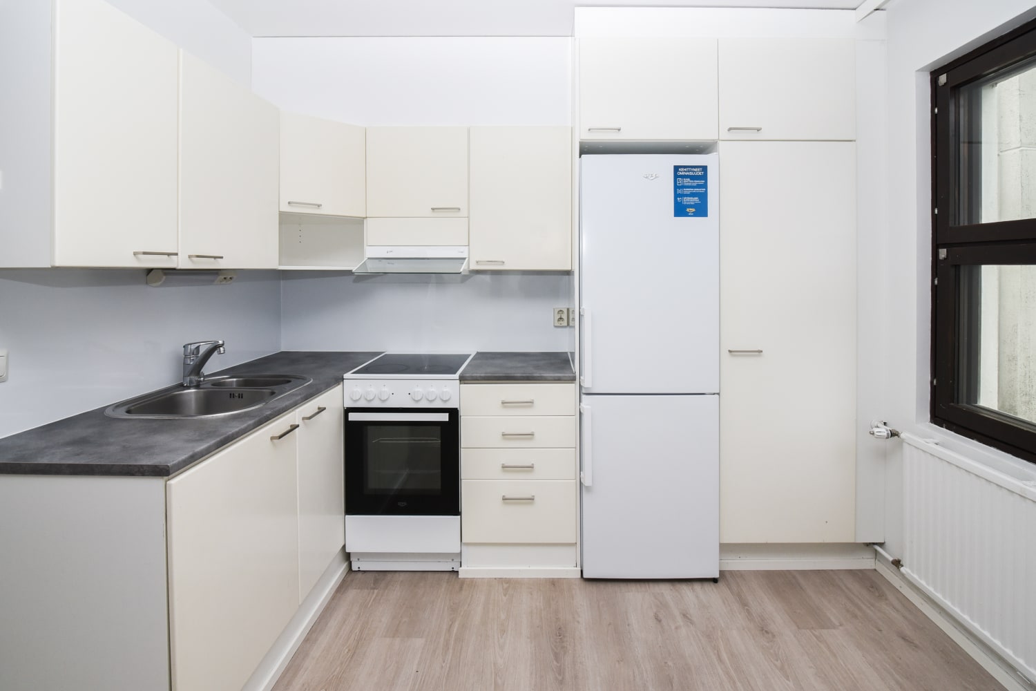The kitchen cabinets are light and the laminate countertops are grey-toned. The space between the upper and lower cabinets is white. The kitchen is equipped with a cooker, extractor hood, and freezer-refrigerator. The appliances are white.
