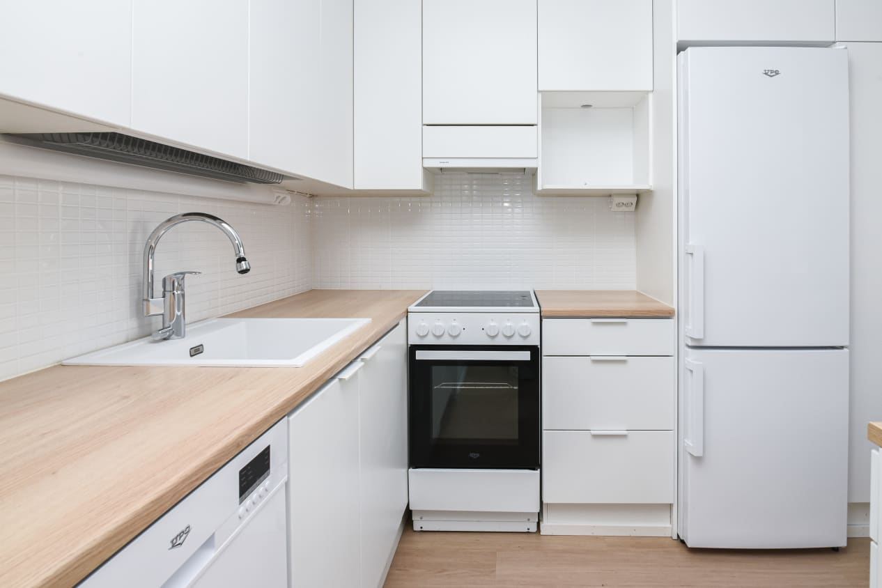 The kitchen is equipped with a dishwasher. The bathroom features furniture from the Finnish Kide collection and has space for a washing machine.