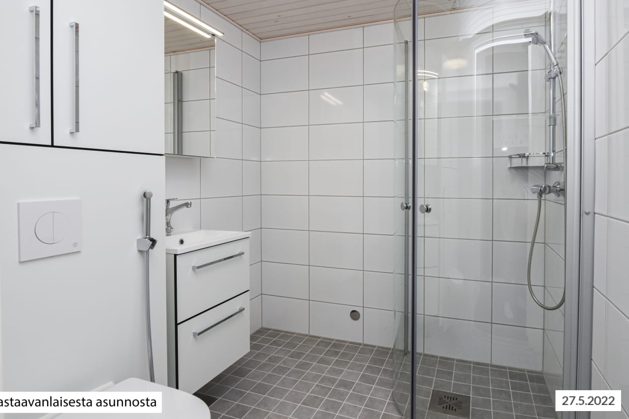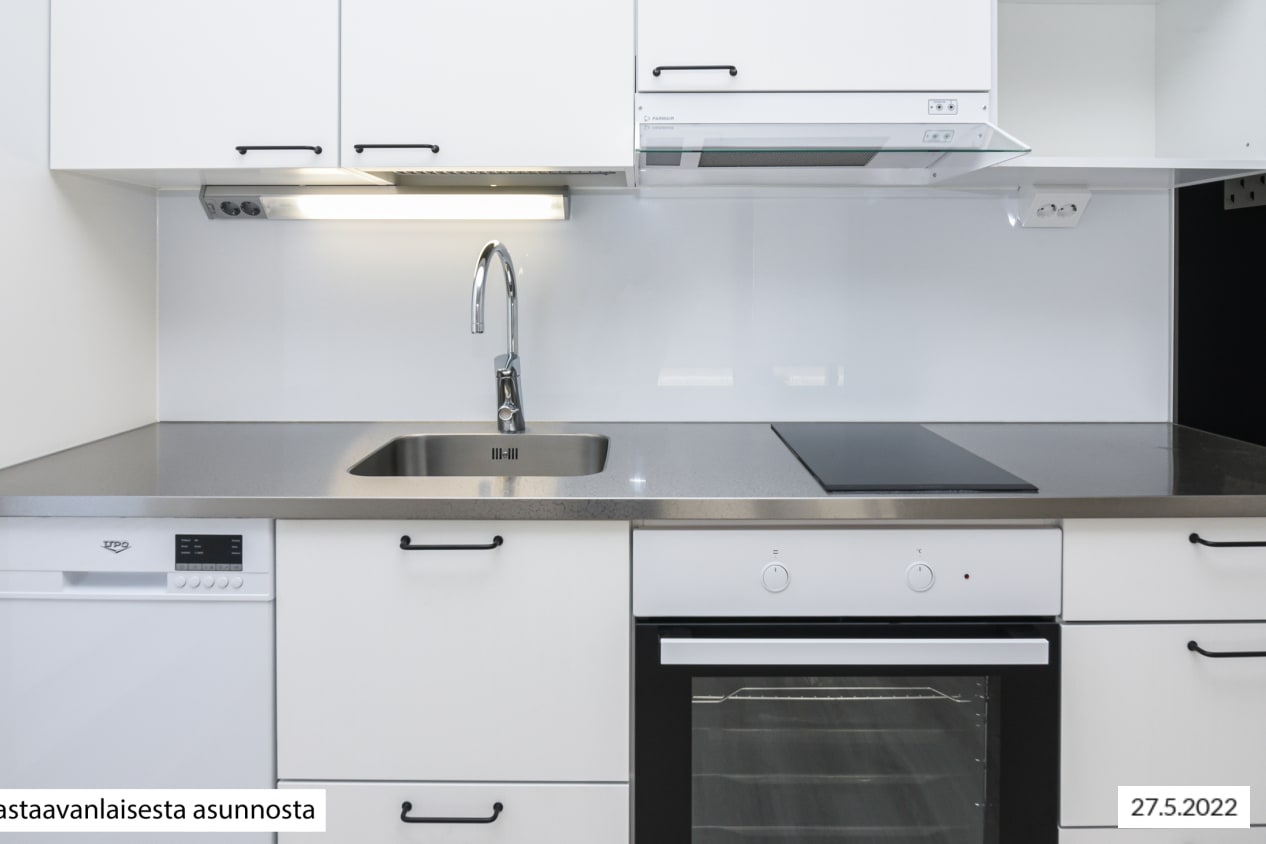 This studio apartment on the first floor of a courtyard building, completed in spring 2022, is clear and compact. The open kitchen and living room form a unified space that extends to the glazed balcony. The home's surface materials are timelessly beautiful. The flooring in the living areas is light-toned laminate, and the walls are painted white.