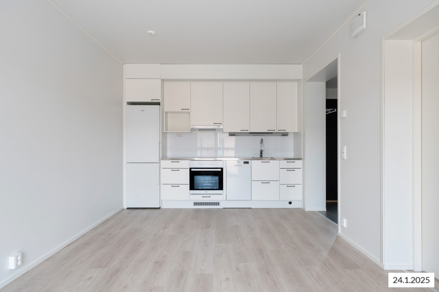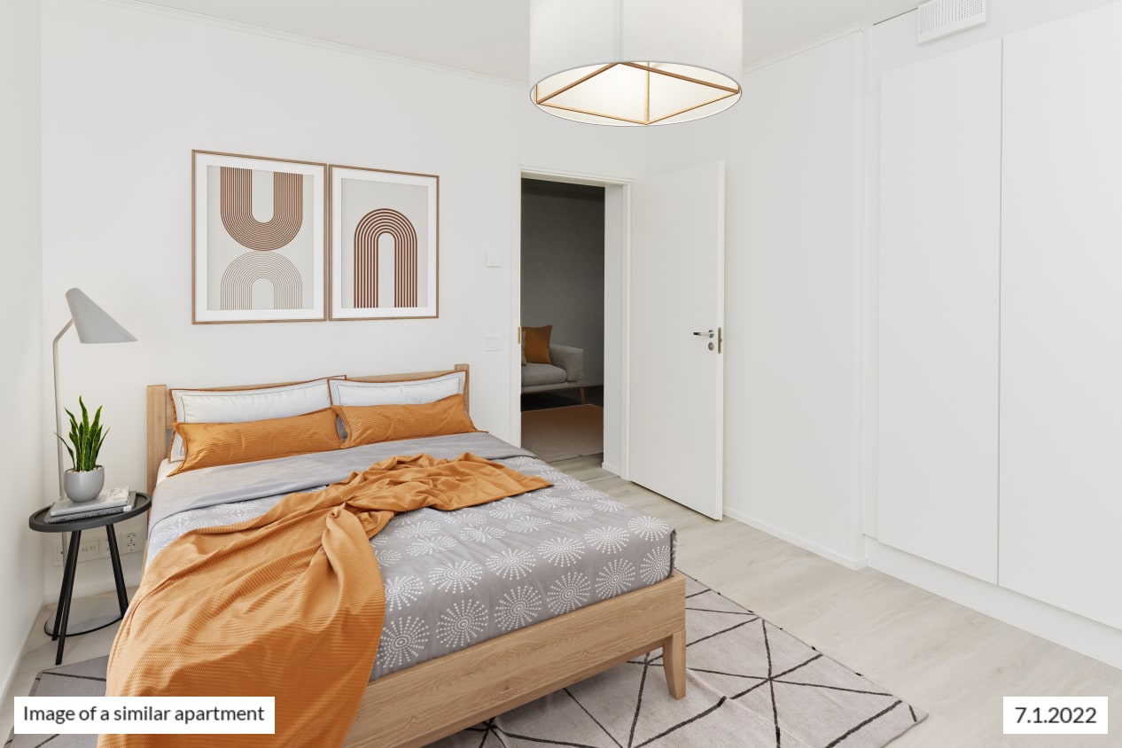 This beautiful and practical one-bedroom apartment is located on the second floor of a walk-up building completed in spring 2022. The open-plan kitchen and living area provide a versatile space that’s easy to furnish to your taste. The glazed balcony, extending from the living room, adds a sense of openness and extra room. The home features timelessly elegant materials, with light-toned laminate flooring in the living areas and white-painted walls.