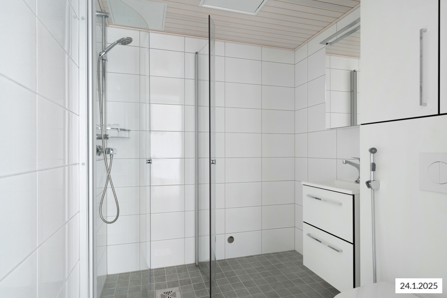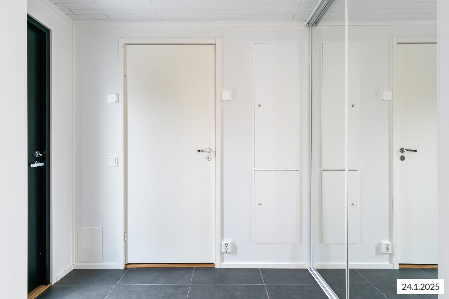 The bathroom is equipped with white furnishings from SATO’s Kide collection and has space for both a washing machine and dryer. The walls are tiled in white, and the floor is grey. The entryway features a dark grey tiled floor, a black accent wall behind a metal coat rack, and mirrored sliding doors on the closets.