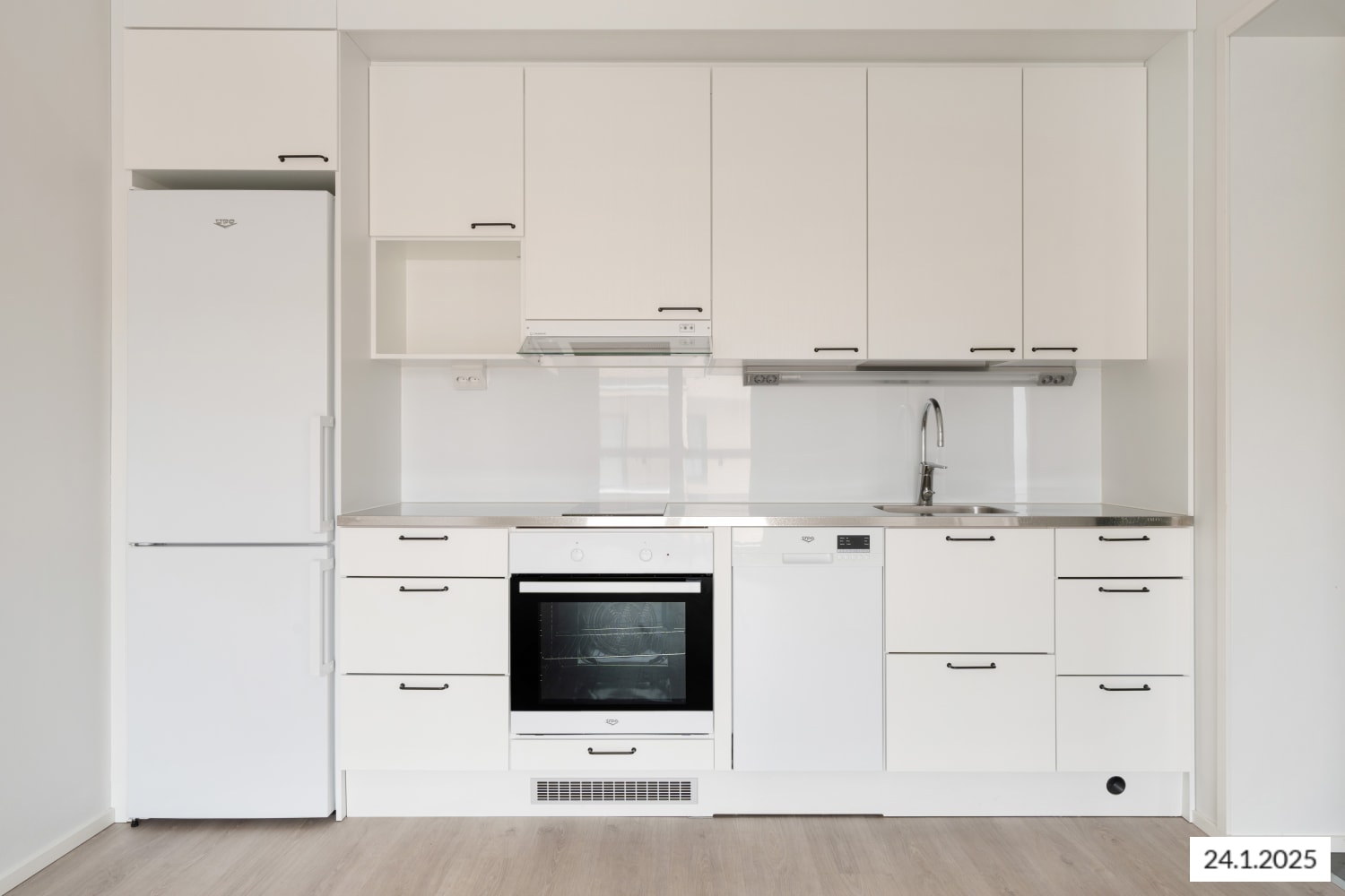 The sleek open kitchen has white wood-grain textured cabinets with black handles, a white panel backsplash, and subtly patterned steel countertops. Appliances include an induction cooktop, built-in oven, fridge-freezer, and dishwasher, all in white.