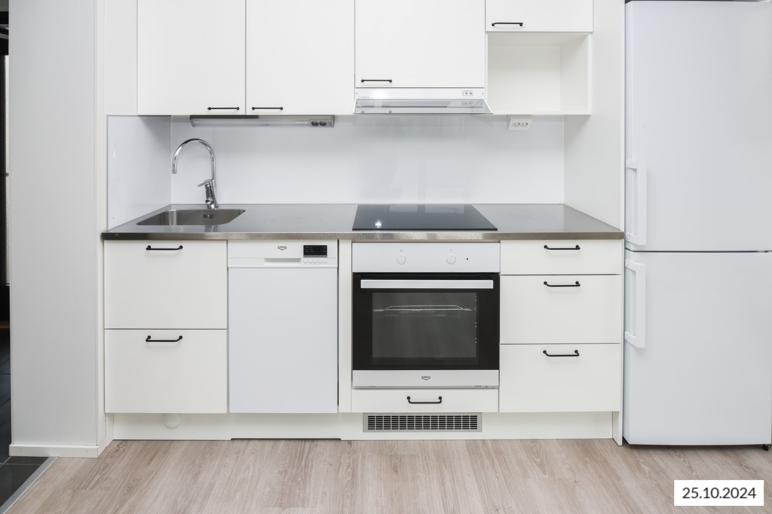 The home's surface materials are timelessly beautiful. The flooring in the living areas is light-toned laminate and the walls are painted white. The streamlined open kitchen features white wood-grain patterned cabinets with black bar handles. The space between the upper and lower cabinets is white paneling and the worktop is subtly patterned steel. The equipment includes an induction cooktop, built-in oven, freezer-refrigerator, and dishwasher. The appliances are white.
