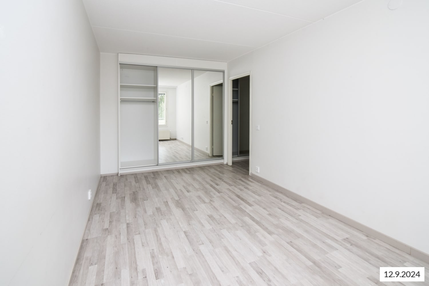 The apartment features light oak laminate flooring and white-painted walls, with a light gray accent wall adding warmth to the living room. The entryway has closets with mirrored sliding doors. The kitchen is equipped with white cabinets, gray laminate countertops, and matching gray laminate in the backsplash area. Appliances include a dishwasher, refrigerator, ceramic stove, range hood, and microwave space. The bathroom walls are tiled in white, with understated gray floor tiles and space for a washing machine.