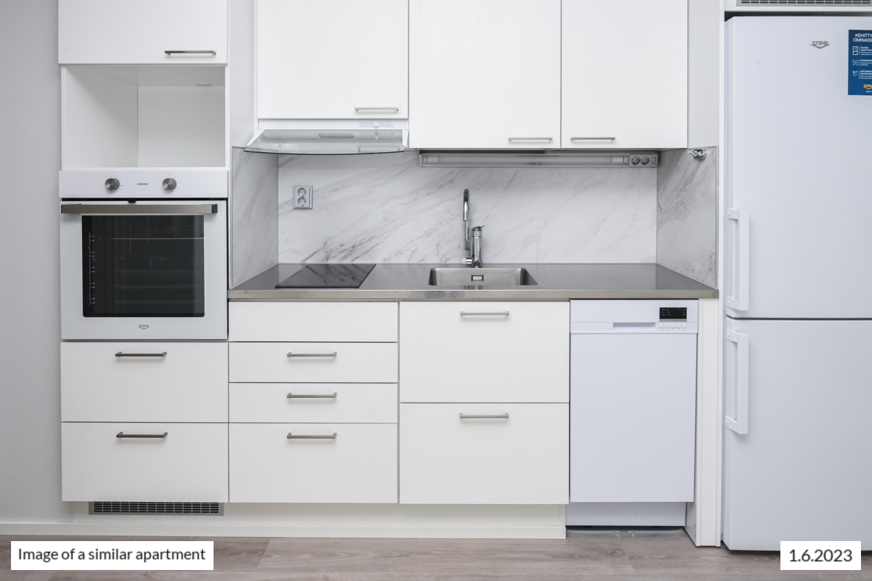 The non-wet rooms have pale laminate flooring and walls painted in pale grey. The kitchen cabinet doors are in white laminate. The backsplash is done in marble-effect composite panel, and the countertop is in part laminate in the same design and in part stainless steel. The kitchen is equipped with an induction cooktop, built-in oven, dishwasher, cold appliances and space for a microwave. All appliances are white. The under-sink cabinet is equipped with SATO’s Seth waste unit consisting of coloured waste bins for easy recycling. The bathroom comes with Kide range furniture designed for SATO. Kide furniture is made in Finland and has been awarded both the Key Flag and the Design from Finland symbols. The bathroom walls are done in white tiles, and the floor tiles are grey. There is space for a washing machine and dryer. All windows are fitted with venetian blinds.