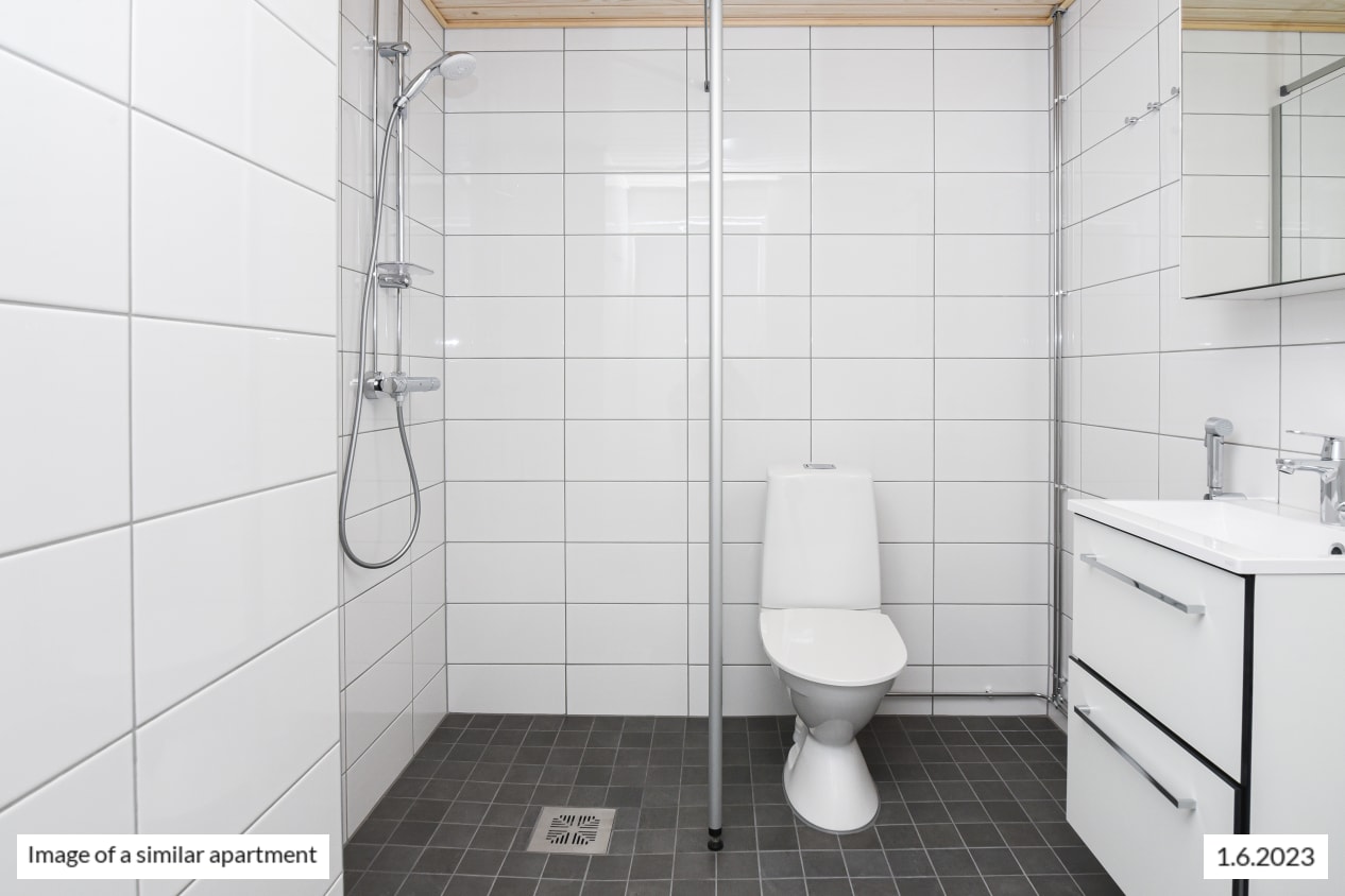 The bathroom comes with Kide range furniture designed for SATO. Kide furniture is made in Finland and has been awarded both the Key Flag and the Design from Finland symbols. The bathroom walls are done in white tiles, and the floor tiles are grey. The spacious bathroom is large enough not only for your spa moments but also for your washing machine and dryer.