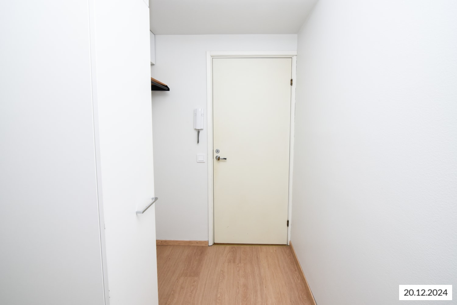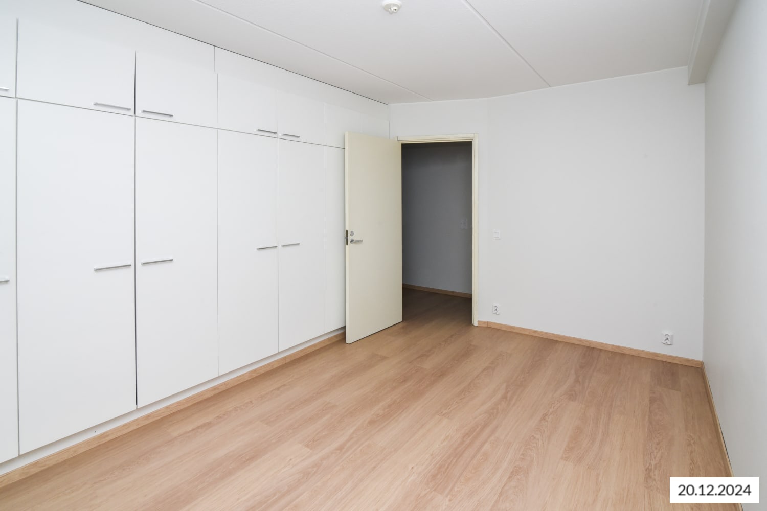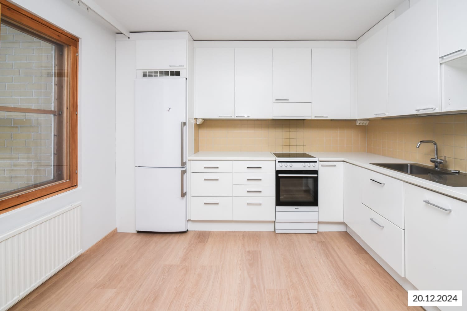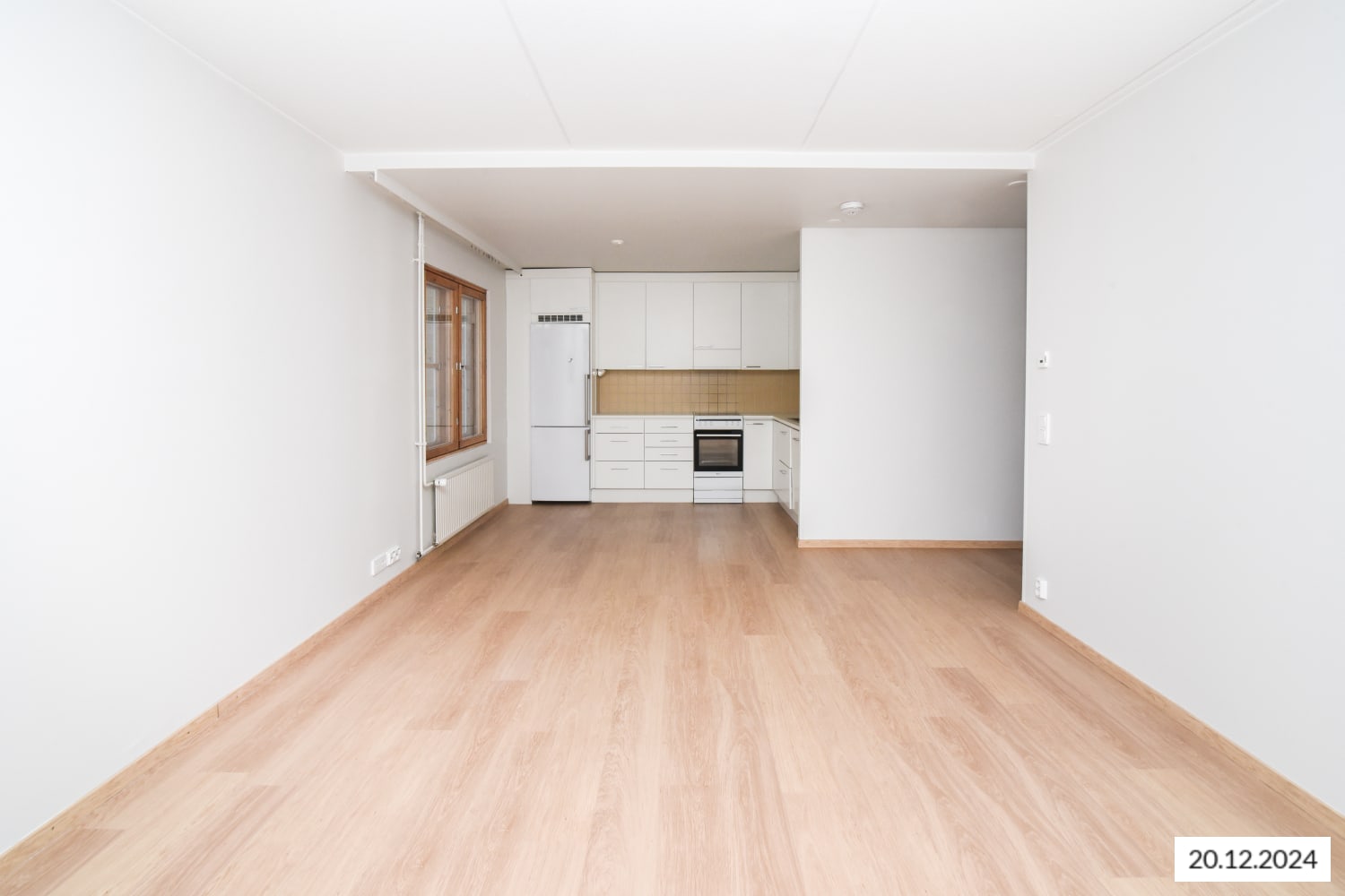 The floors throughout the home are light oak-style laminate, and the walls are painted in a soft, muted white. Closets are white, complementing the kitchen cabinets. The kitchen has white cabinetry with a rosehip-colored backsplash and a white countertop. It is equipped with a ceramic stove, dishwasher, and fridge-freezer. In the bathroom, the floor tiles are a subtle gray, and the walls are primarily light gray with a rosehip-colored accent wall. There is a hookup for both a washing machine and dryer.
