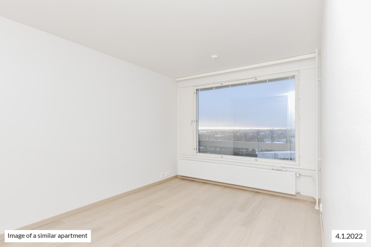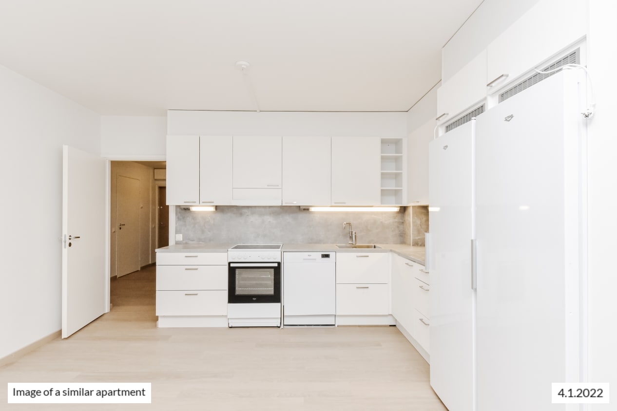 This renovated and efficient through-apartment can easily be furnished to feel like your own home. The heart of the home is the living area formed by the open-plan kitchen and living room, which extends to the glazed balcony. The surface materials are light and simply elegant. The floors are light oak laminate, and the walls are painted white.