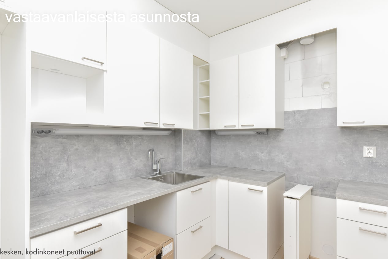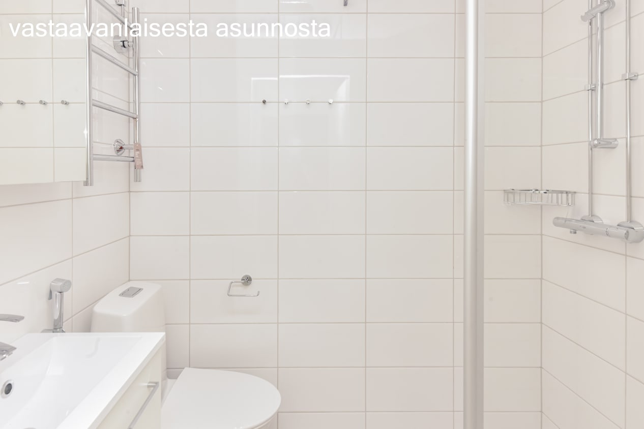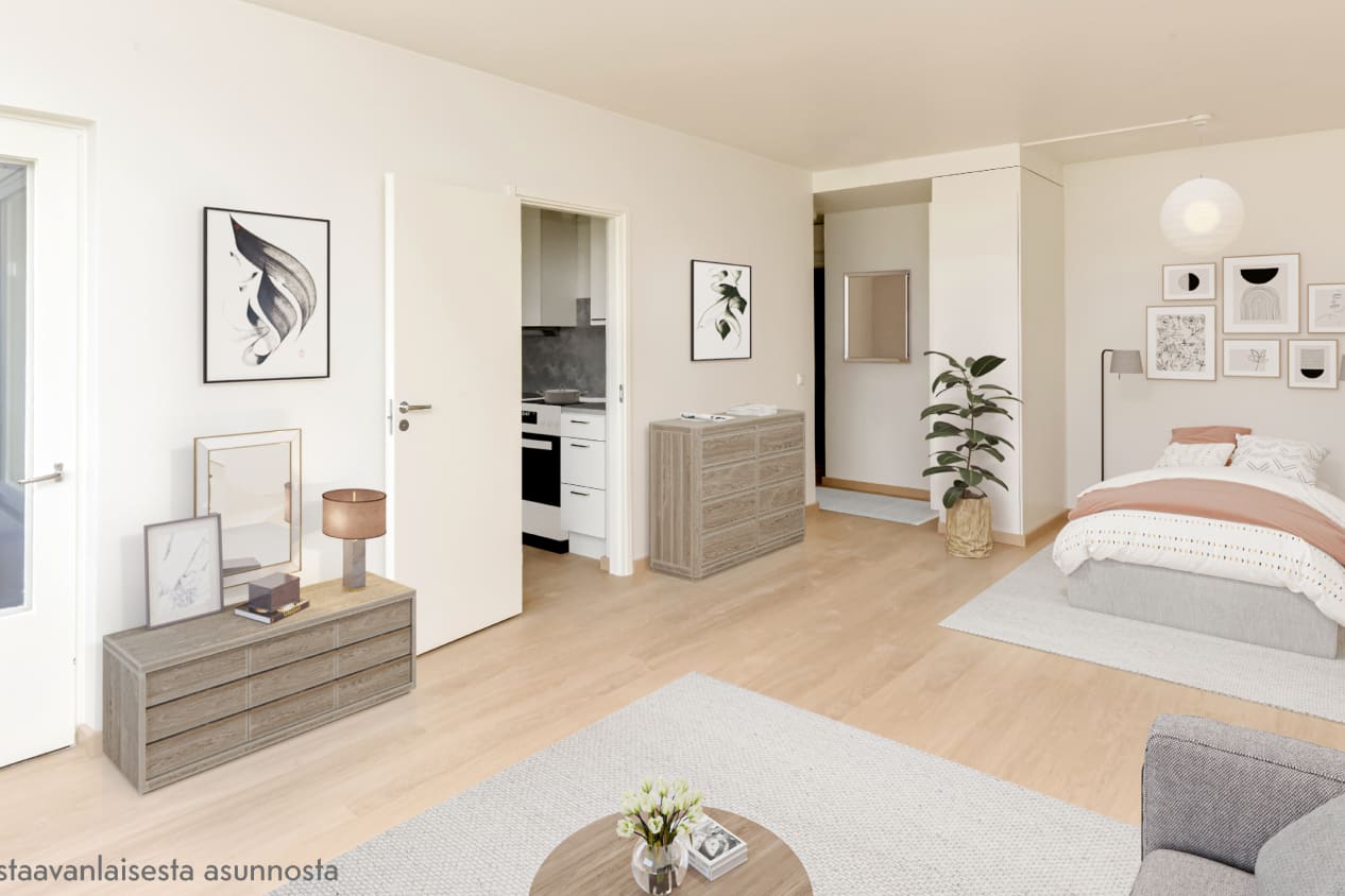 The interior materials of the apartments are light-colored and timeless. The floors are light oak laminate and the walls are painted white. The kitchen units have white cabinets. The space between the top and bottom cabinets and the worktop are grey laminate. In the 1-2-bedroom apartments, the equipment includes a ceramic hob, cooker hood, fridge-freezer and dishwasher. The studios have a ceramic hob and cooker hood and a fridge-freezer. Kitchen appliances are white. The furniture in the bathroom is from SATO's Kide collection. Their material is a very durable and beautiful white solid laminate. The bathroom walls are white tile, and the floor tiling is gray.