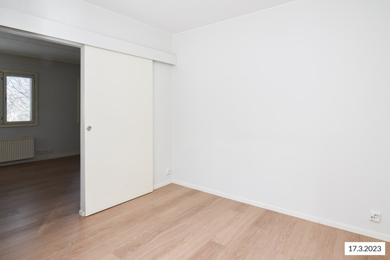The windows of this bright and light-toned one-bedroom home open in two directions. The open kitchen and living room create a spacious living area. There is room for a proper dining table cozily placed under the kitchen window. You can decorate the balcony, extending from the living room, to create your own summer oasis.