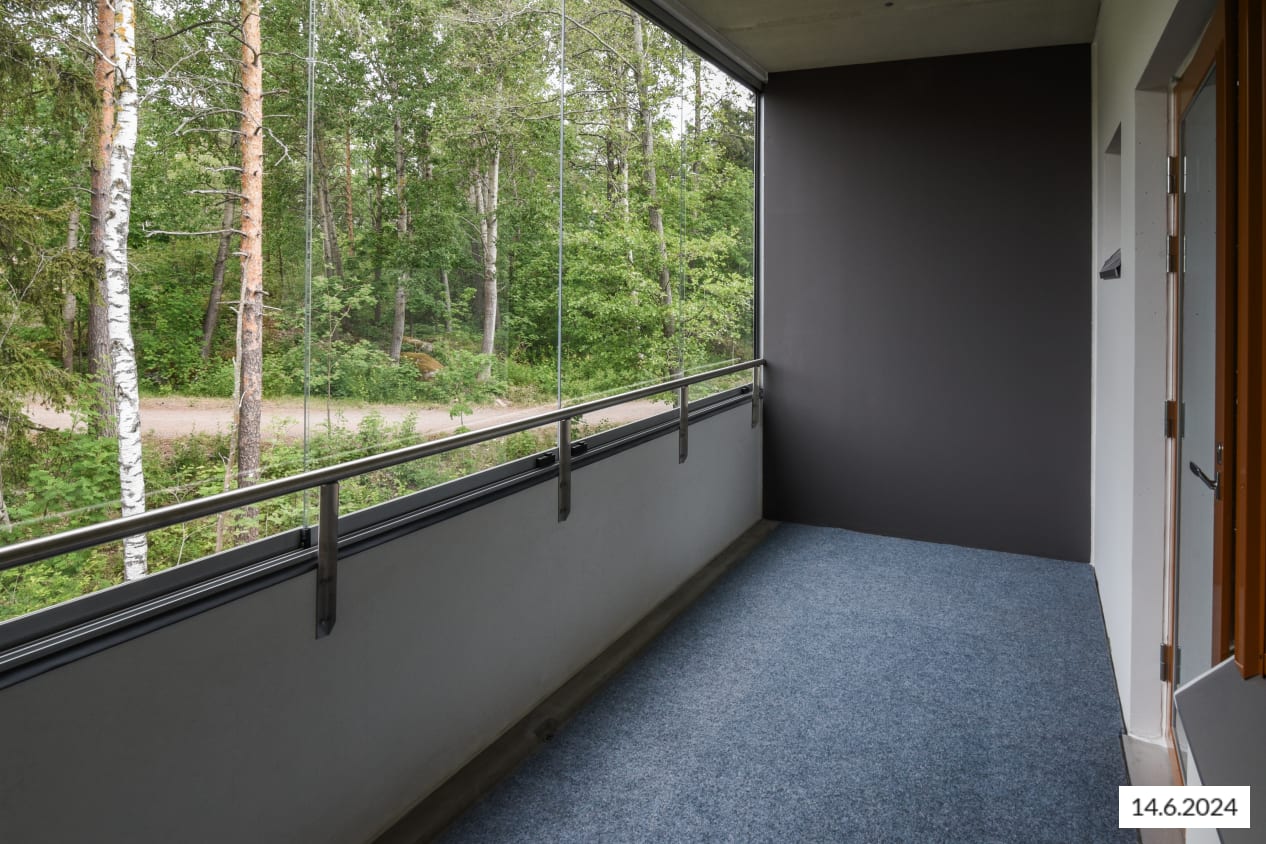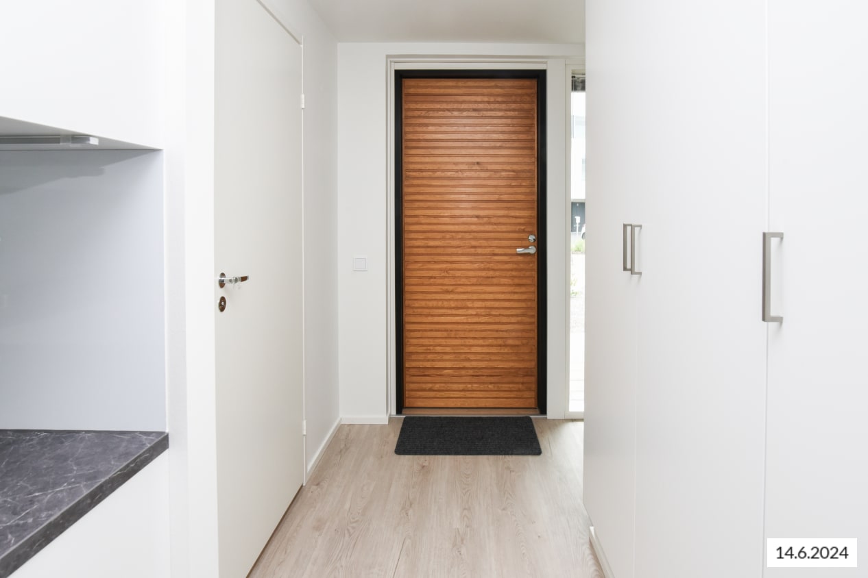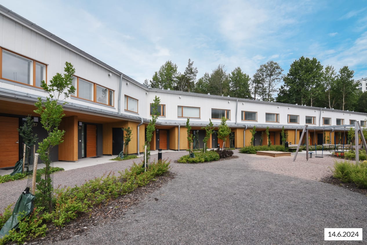 Here’s a wonderful opportunity to secure a home in a row house completed in 2024! This beautiful rental home offers two glazed balconies and bathrooms, as well as a private sauna, taking comfort to the next level. The bright home has plenty of storage space, with both cold and warm storage rooms near the entrance. The balconies, which span the width of the apartment, provide views of the lush nearby nature.