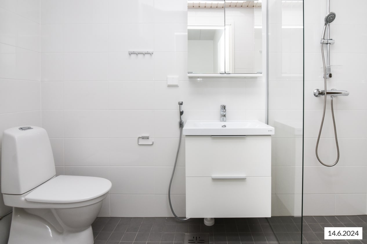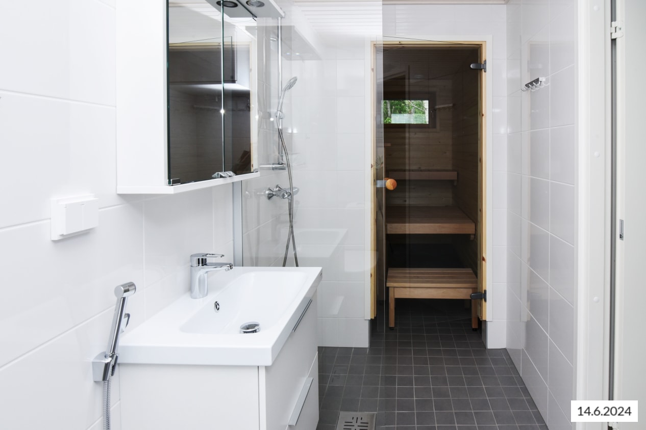 How would it feel to relax in your own sauna after a long day? The downstairs also has a second toilet with a shower, adding a touch of luxury to everyday life. The apartment’s fresh bathrooms are tiled with large white wall tiles and the floors are 10 x 10 grey tiles. The ceilings are light wood, and the bathroom fixtures are white. There is space and connections for a washing machine and dryer in the upstairs bathroom.