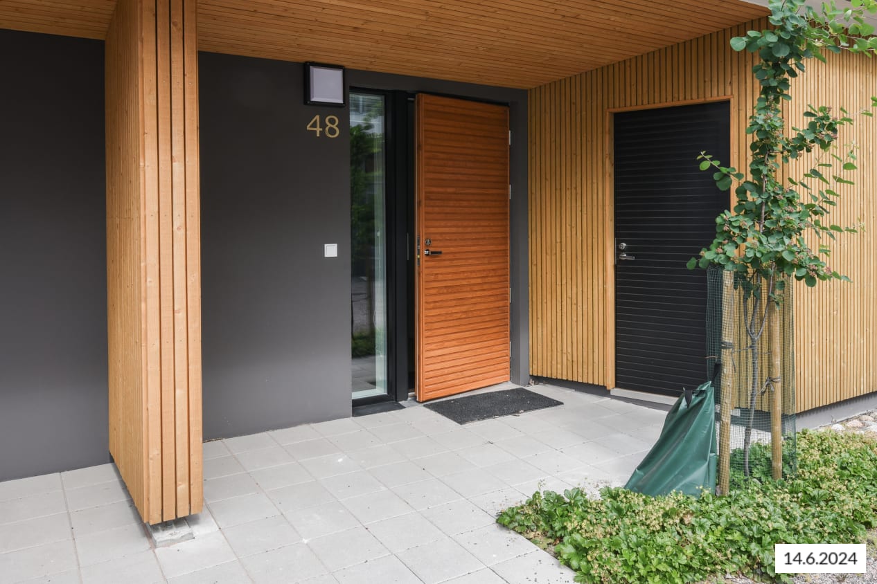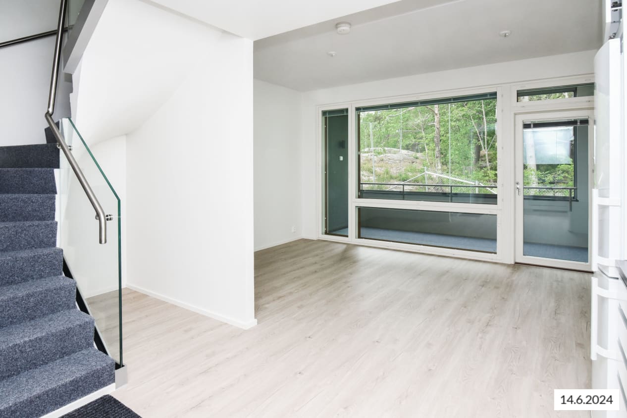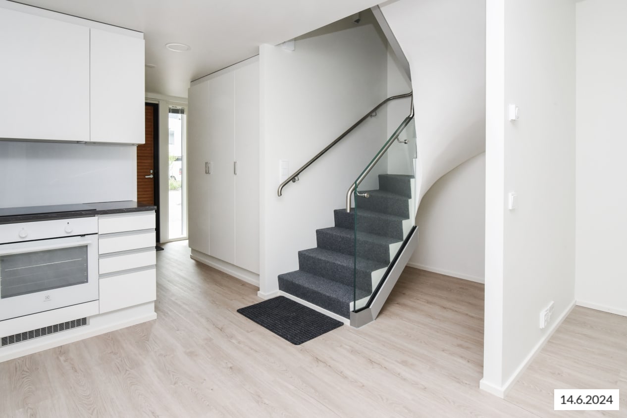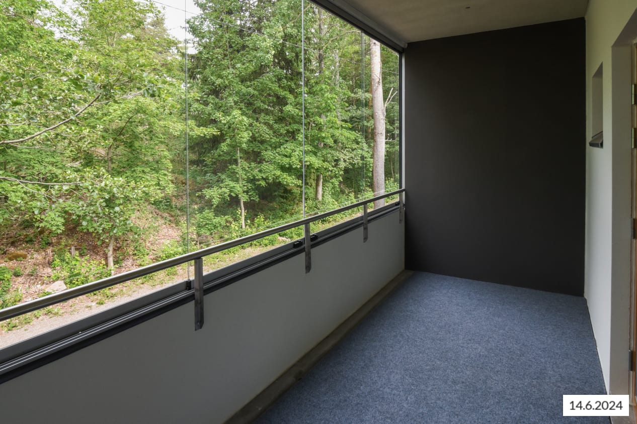 Here’s a wonderful opportunity to secure a home in a row house completed in 2024! This beautiful rental home offers two glazed balconies and bathrooms, as well as a private sauna, taking comfort to the next level. The bright home has plenty of storage space, with both cold and warm storage rooms near the entrance. The balconies, which span the width of the apartment, provide views of the lush nearby nature.