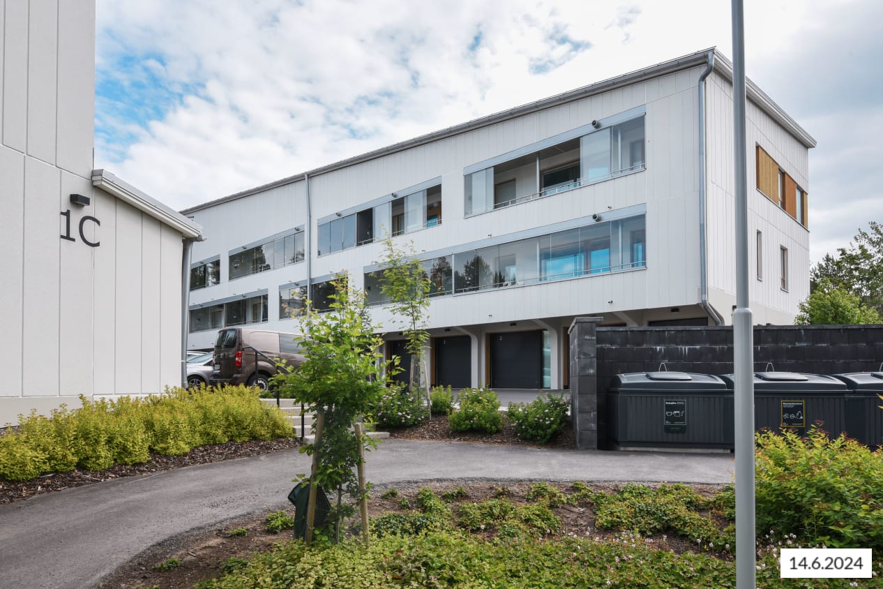 The building includes fifty-one apartments. The basement houses the air raid shelter, garages, and bicycle storage room. The yard offers twenty-six parking spaces, some with heating poles and electric car charging sockets. One space, managed by the association, provides electric car charging for an additional fee. The façades of Pihlajistonkatu 1 are made of grooved, painted, or smooth-surfaced natural grey or white concrete elements, featuring wooden cladding. The roof is sheet metal. Balconies are constructed from reinforced concrete elements with unpainted surfaces. They have concrete railings and side-sliding glazing. The backs and edges are painted. The buildings are heated with district heating, using either water-circulated radiators or underfloor heating. Bathrooms have water-circulated underfloor heating. Electricity and domestic water are measured individually. Apartments have supply and exhaust air handling units with heat recovery, controlled from the cooker hood (away/home/boost). Smoke detectors are connected to the electrical network with battery backup. The main entrance has a code lock. Windows have venetian blinds. Floors are mid-tone wood-coloured vinyl planks. Bedroom wardrobes have white doors with black knob handles. The kitchen features greige or white cabinet doors with black knob handles, light or dark laminate countertops, white backsplash, and white appliances. The dishwasher is integrated, and there is space for a microwave. Bathrooms have white wall tiles and 10 x 10 grey floor tiles. The ceiling is white-lacquered spruce paneling, and the fixtures are white. Bathrooms include connections for a washing machine and space for a laundry tower, with the ventilation unit above. Sauna benches are alder, and the ceiling is spruce paneling.