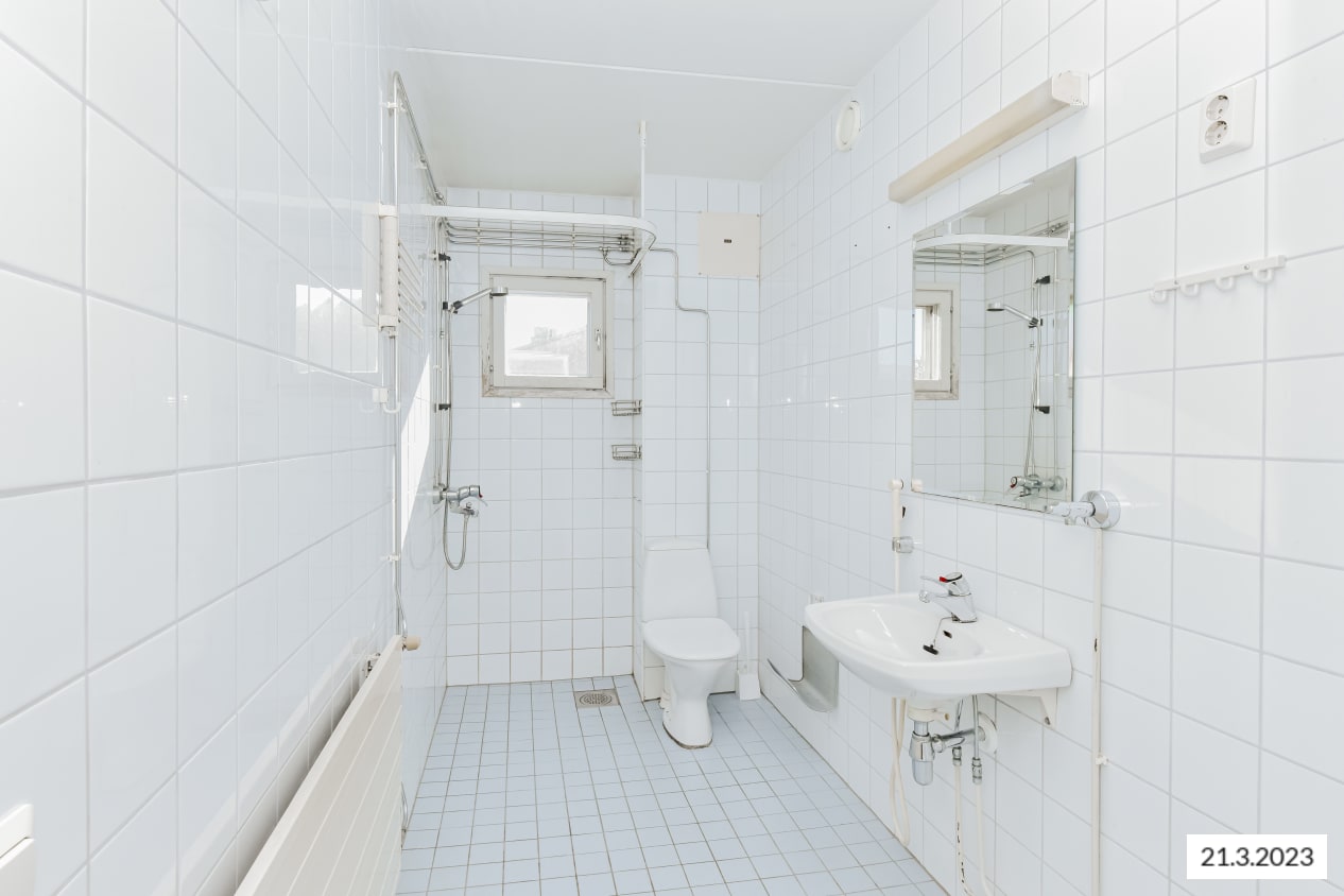 Fully renovated in 2023, the bathroom walls are done in white tiles and the floor in grey, smaller tiles. The fresh bathroom has space for a washing machine.