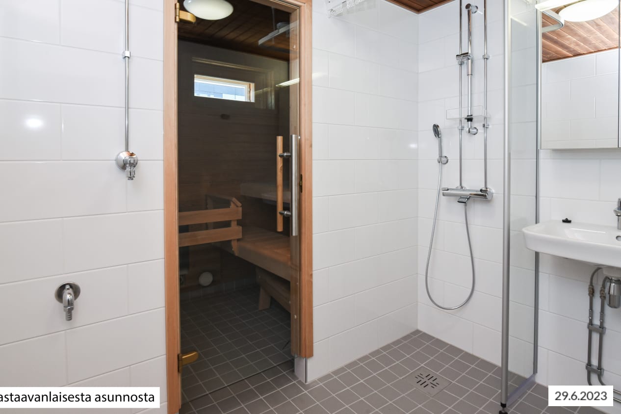 Fully renovated in 2023, the bathroom walls are done in white tiles and the floor in grey, smaller tiles. The fresh bathroom has space for a washing machine.