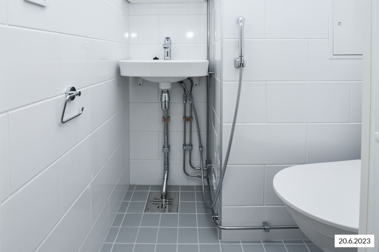 Fully renovated in 2023, the bathroom walls are done in white tiles and the floor in grey, smaller tiles. The fresh bathroom has space for a washing machine.