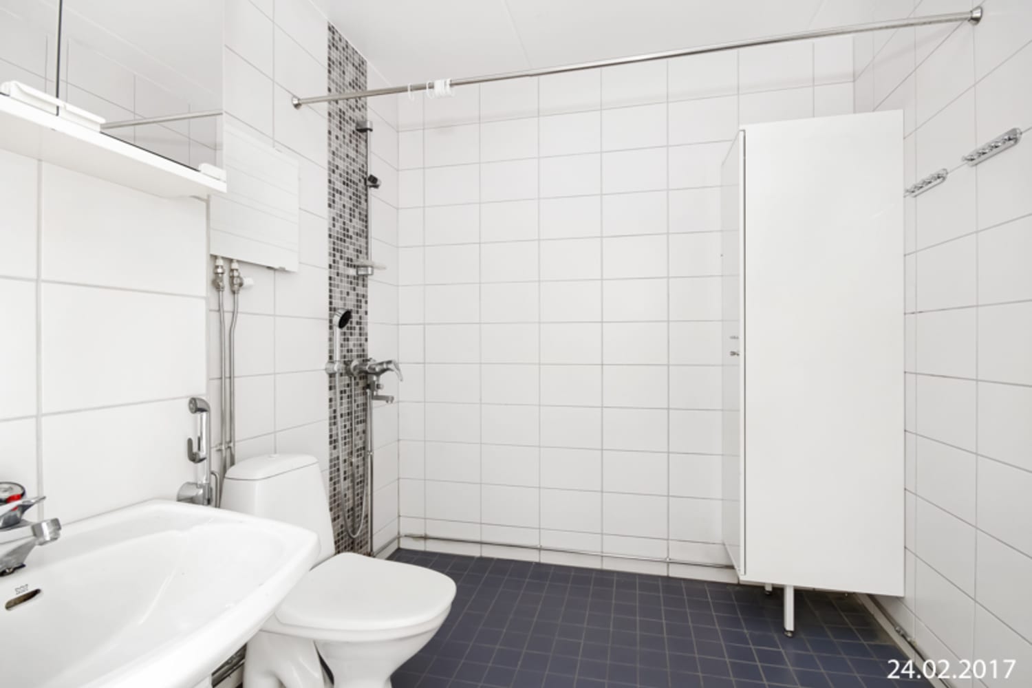 Fully renovated in 2023, the bathroom walls are done in white tiles and the floor in grey, smaller tiles. The fresh bathroom has space for a washing machine.