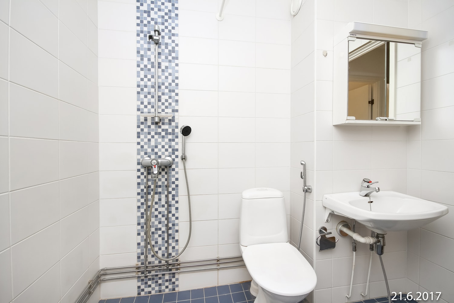 Fully renovated in 2023, the bathroom walls are done in white tiles and the floor in grey, smaller tiles. The fresh bathroom has space for a washing machine.