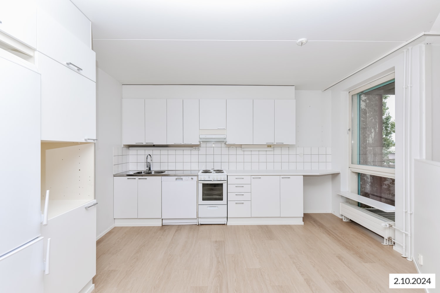 The kitchen is equipped with a dishwasher, fridge-freezer, floor oven, and a traditional stove. The space between the upper and lower cabinets is stylishly tiled in white. The bathroom also has a connection for a washing machine.