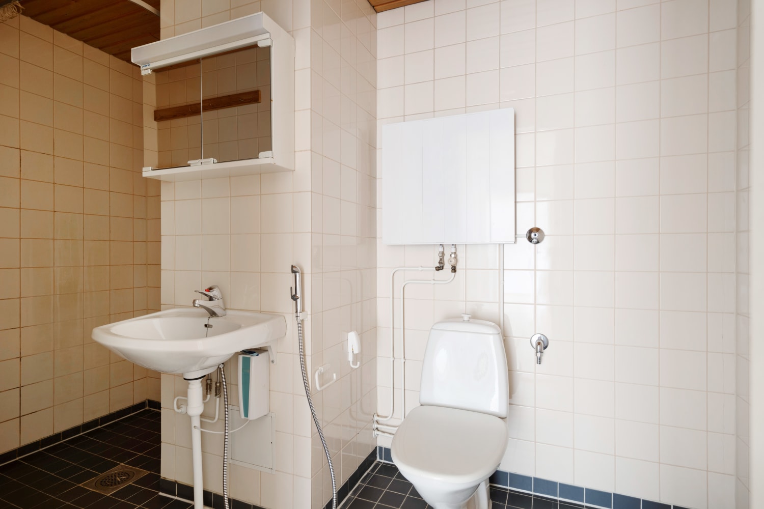 The kitchen offers ample space for both cooking and your dishwasher. The bathroom is tiled and has connections for a washing machine.