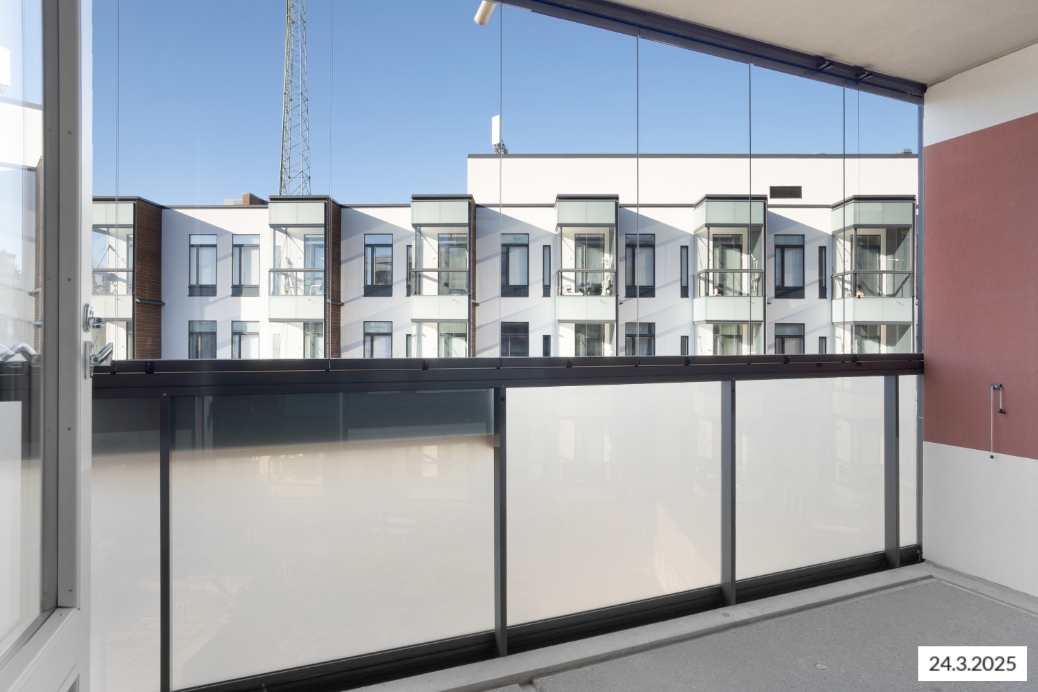 When space is limited, an open-plan layout is often the best solution—and that’s exactly what you’ll find in this cosy studio. The highlight of the home is a sunny, glazed balcony of around ten square metres—perfect for enjoying views over the shared courtyard.