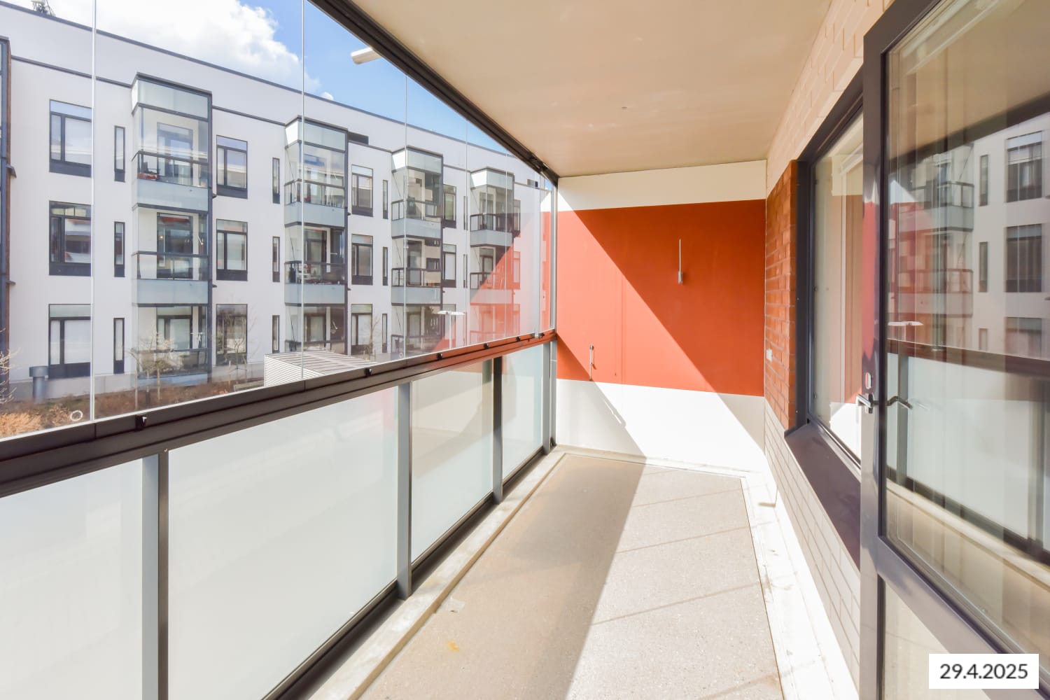 When space is limited, an open floor plan is often the best solution - as seen in this cosy studio apartment. The home is crowned by a glazed, approximately ten square metre sunny balcony, perfect for admiring the courtyard views.