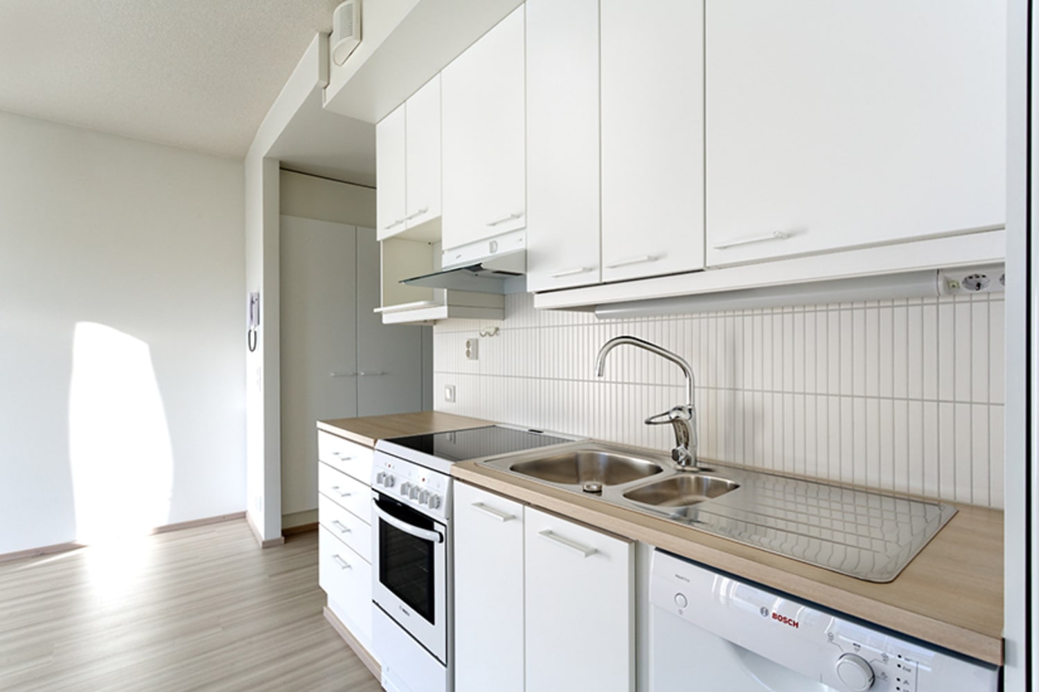 The sunny homes feature glassed-in balconies opening onto the grounds (the ground-floor homes have private gardens) and most are also equipped with a private sauna. The modern Scandinavian-style homes have light-coloured surface materials. The floors are done in white varnished oak-look laminate and the tiled bathrooms are fitted with underfloor comfort heating. Standard equipment in all homes includes a fridge-freezer, four-burner electric cooker and dishwasher. All bathrooms have space for a washing machine and dryer.