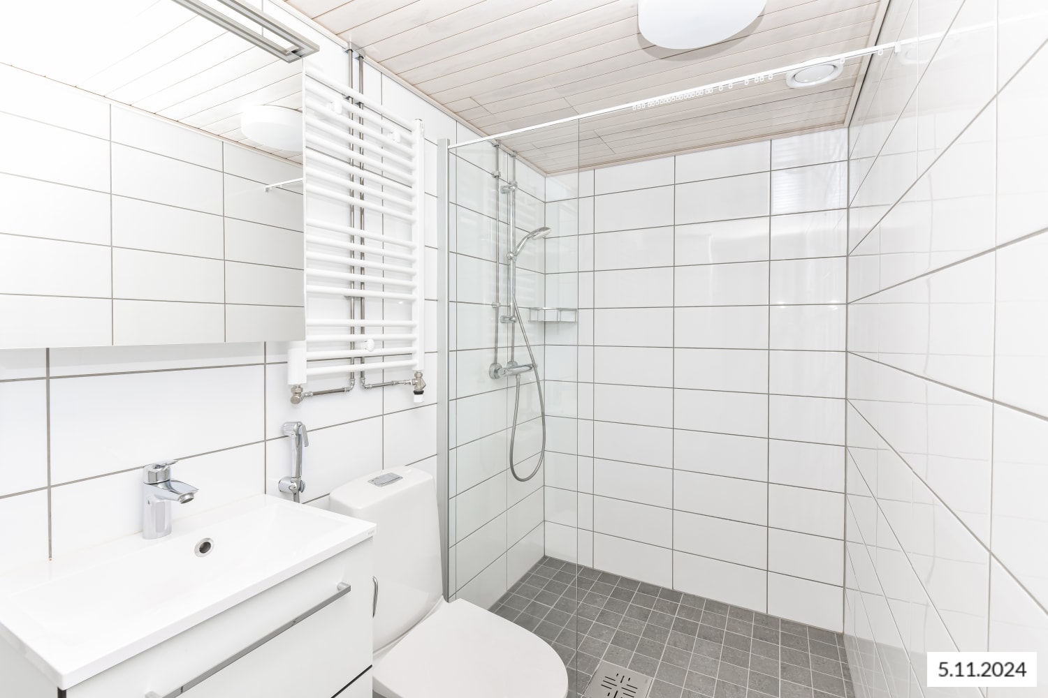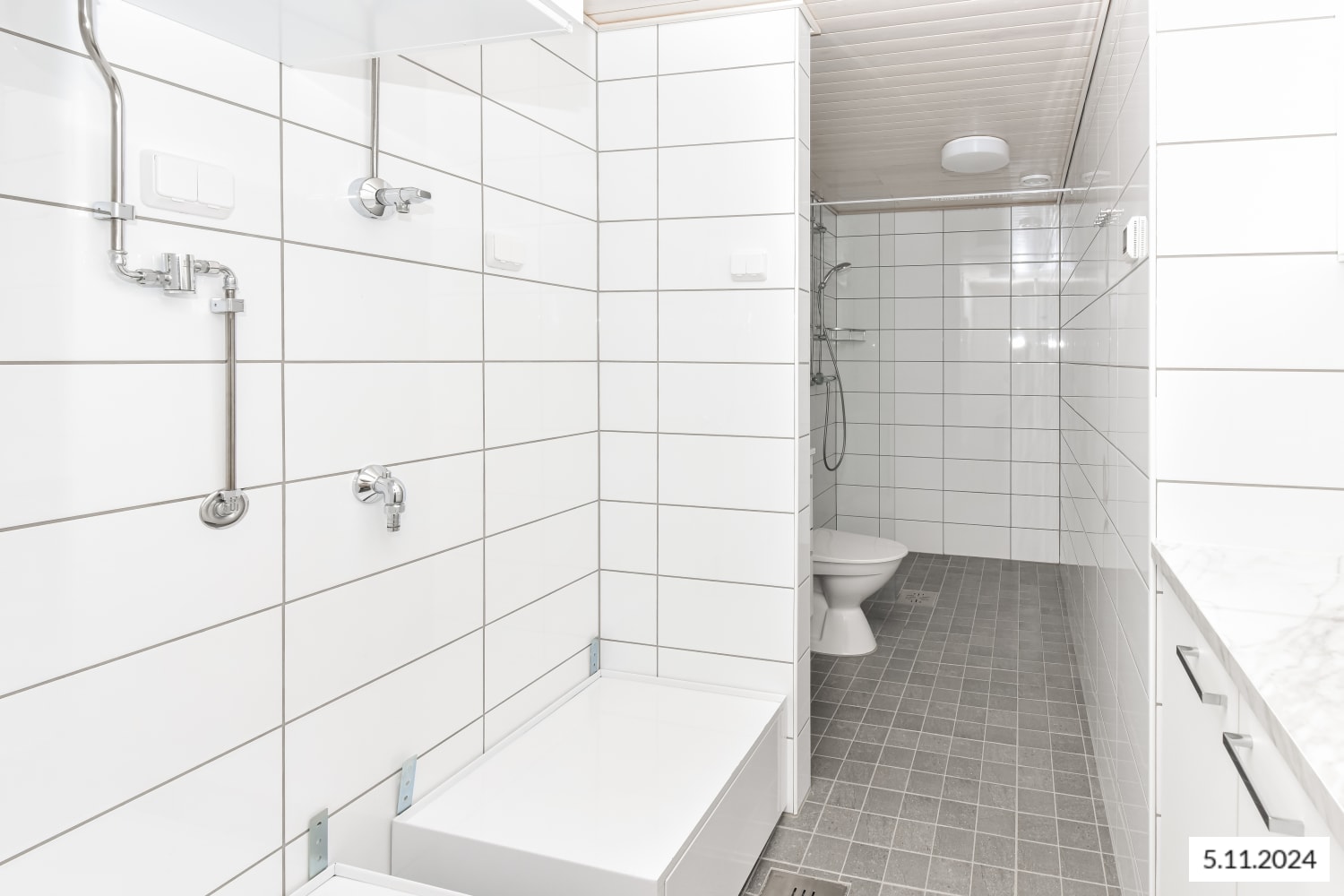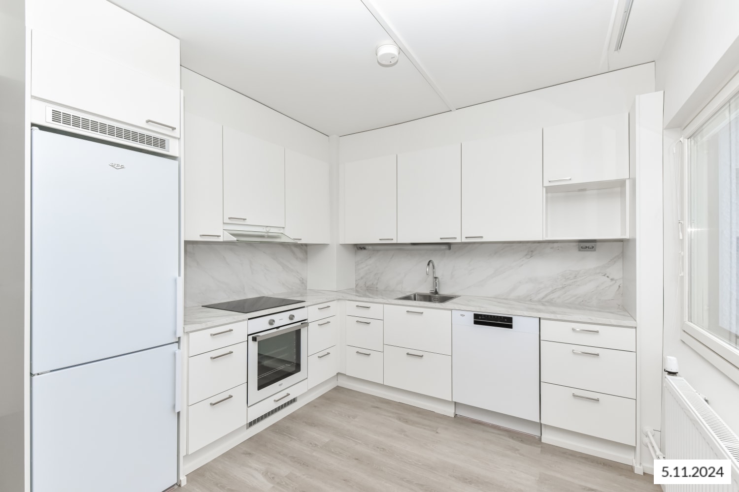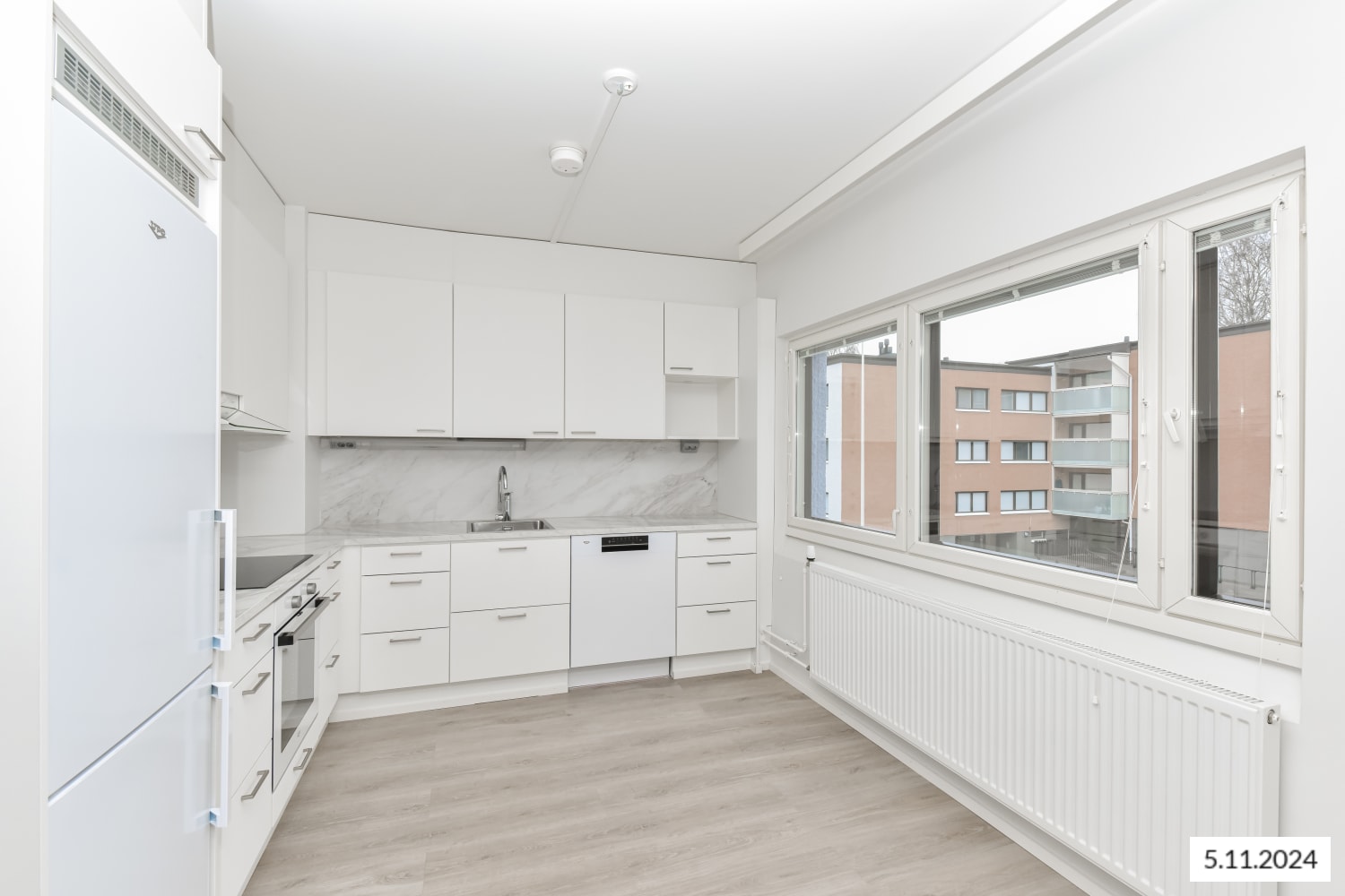The timeless colour scheme makes it easy to decorate the apartment. The walls are painted in white and the ceilings are spray plastered. The entrance hallways have white wardrobes with sliding mirror doors, while other cabinet and wardrobe doors are white. Some entrance hallways also feature closets with doors. The living room, bedroom, entrance hallway, walk-in closet and kitchen floors are done in light grey oak laminate and the skirting boards in white wood. The cabinets and wardrobes of the non-wet rooms have matt-white microlaminate doors. The walls and ceilings are painted in white. The kitchen worktops are in marble-look laminate and the backsplashes in composite panel. Kitchen unit doors and drawer fronts are in matt-white microlaminate. The inset sinks are in stainless steel. The kitchen under-unit lighting comes with power sockets. The kitchen area is equipped with a four-burner induction cooktop, a 60 cm built-in oven, a cooker hood with light, a fridge-freezer and a 60 cm or 45 cm wide dishwasher. There is space for a microwave. The bathroom walls are done in white, glossy 20 x 40 cm tiles. The bathroom and sauna floors are done in dark grey ceramic 10 x 10 cm tiles and the ceilings in wooden panelling. The furnishings include a massive-laminate cabinet under the wash basin and a mirror cabinet with a light, with some of the apartments also featuring a laundry cabinet. The bathrooms come with hookups and space for a washing machine. The shower enclosure is equipped with a shower wall and a shower curtain rail. The wet rooms have electric comfort heating connected to the apartment's electricity. The balconies are equipped with retractable balcony glass panes that allow you to extend the summer much longer on your own, sheltered balcony.