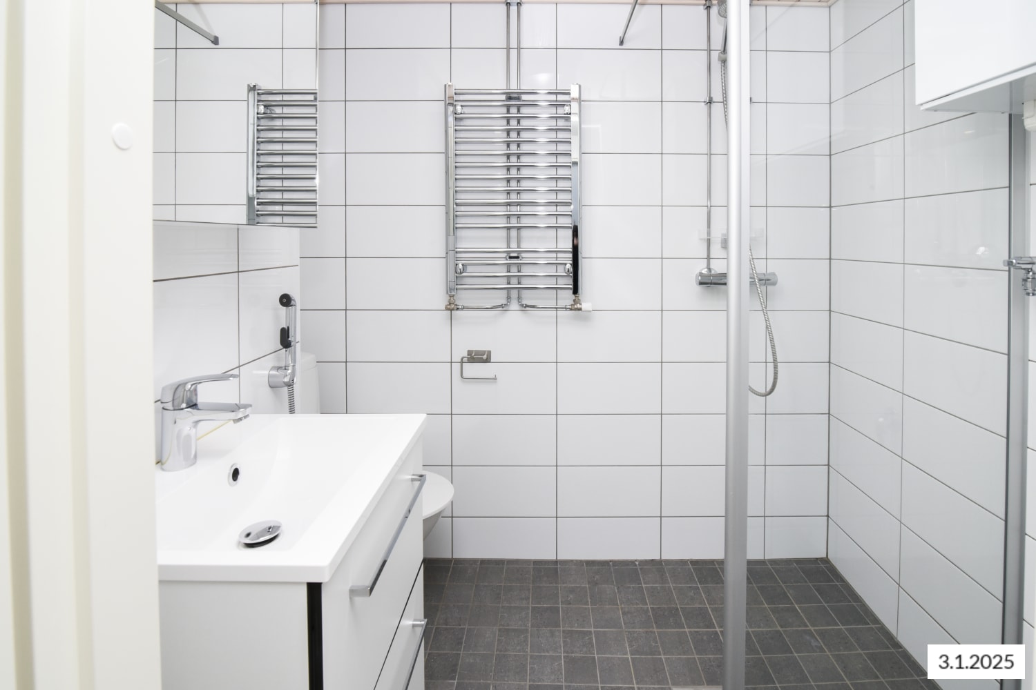 The bathroom features SATO’s Kide collection furnishings and space for a washing machine. Walls are tiled in white, with a grey tiled floor. The spacious hallway provides extra storage with ample closet space.