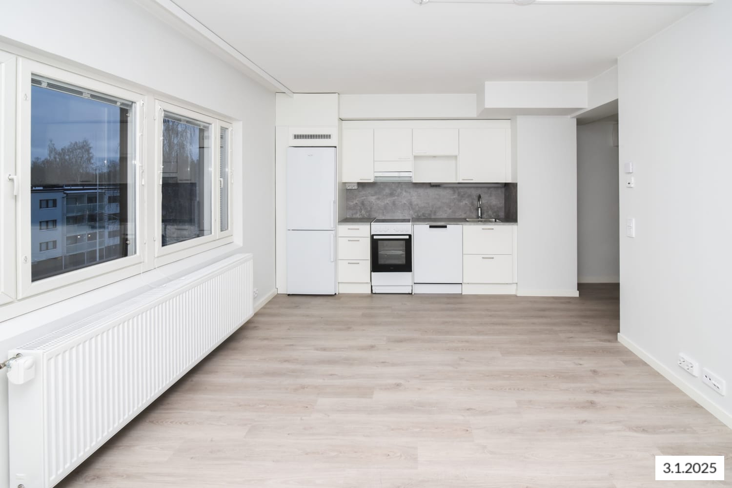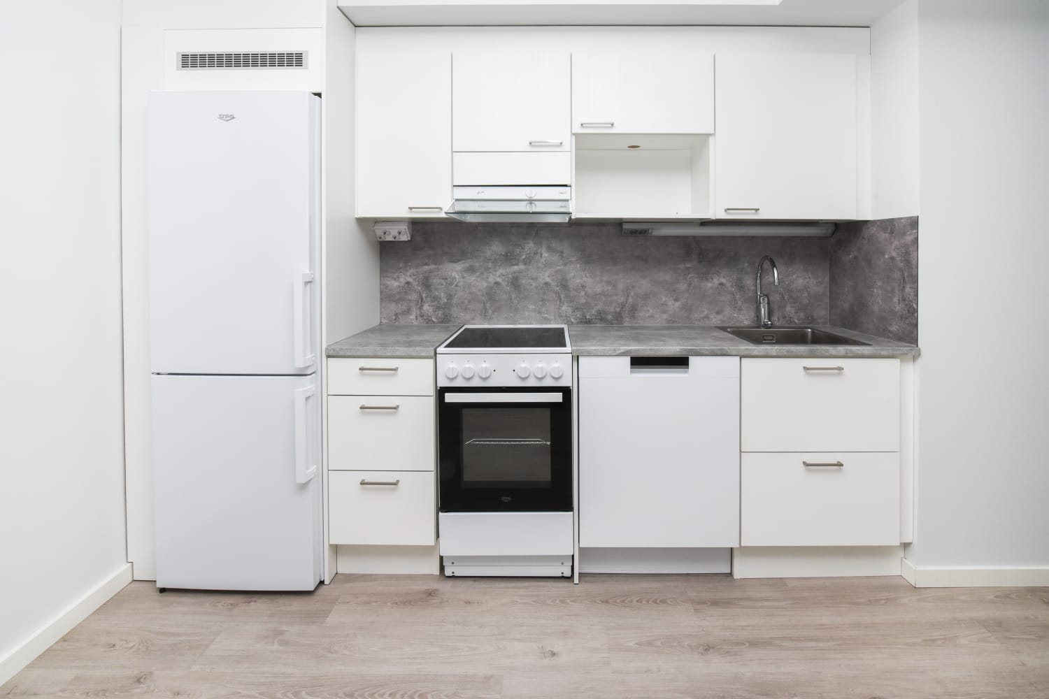 A bright and modern one-bedroom apartment, set to be completed after renovation in early August, features a functional and contemporary layout where the kitchen and living room form a cohesive space that’s easy to decorate to your liking. The home’s surfaces are light and minimalist, with pale oak laminate flooring and white painted walls. The sleek open-plan kitchen is equipped with white cabinets, a grey laminate backsplash, and matching countertops. Appliances include a ceramic hob, cooker hood, fridge-freezer, and dishwasher, all in white.