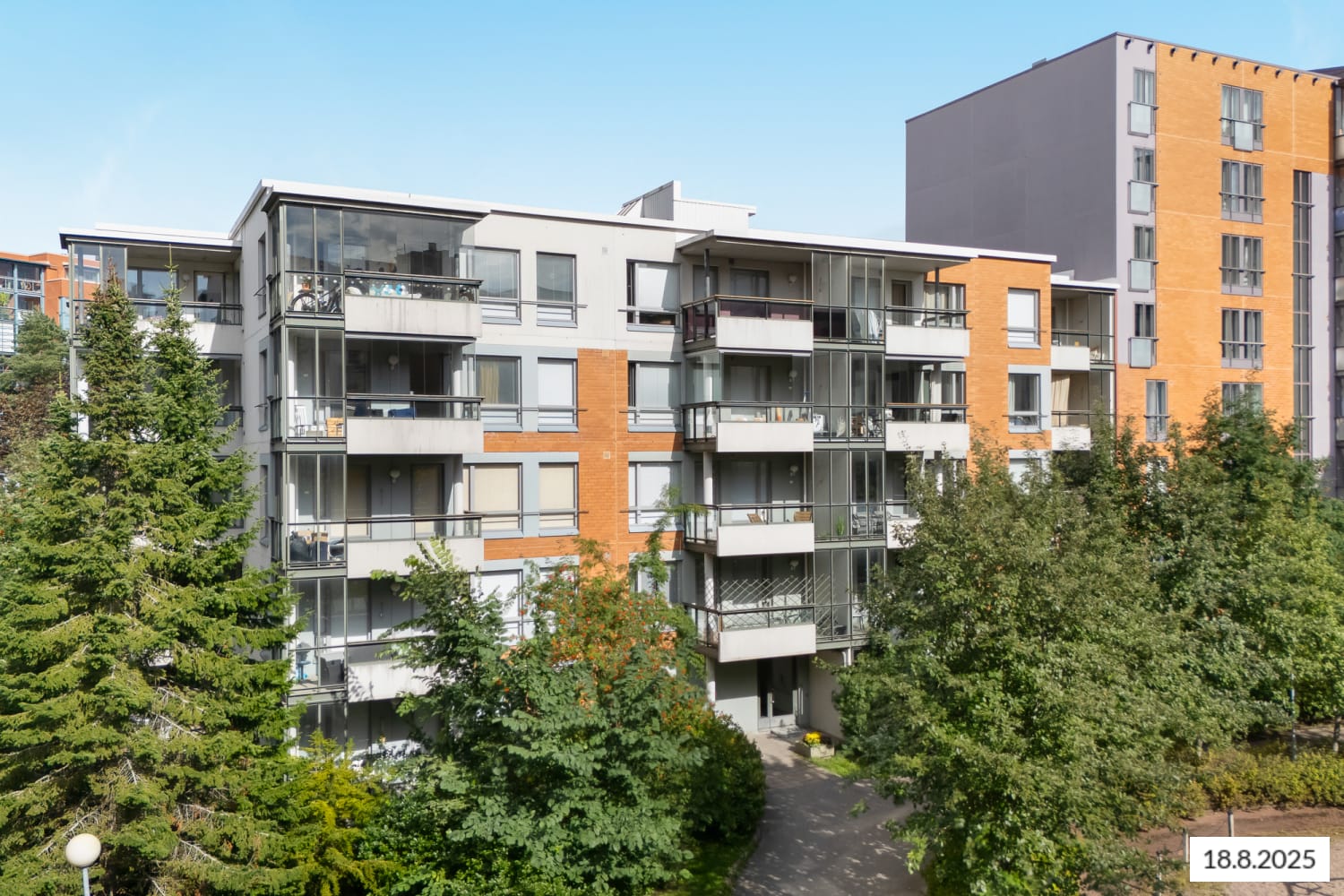 This five-storey building enjoys excellent transport links: the light rail stop is just a short stroll away, and Valimo train station is within easy walking distance, too. Daily errands are simple with a convenient supermarket almost next door. All of the apartments in the building have a balcony or terrace. There is a window above the kitchen and kitchenette doors for added access to light. The bathrooms have tiled walls and space for a washing machine. All apartments except for the studios also have space for a dishwasher. Together with the neighbouring buildings, the buildings form sheltered grounds with a pleasant and leafy play area in the middle.