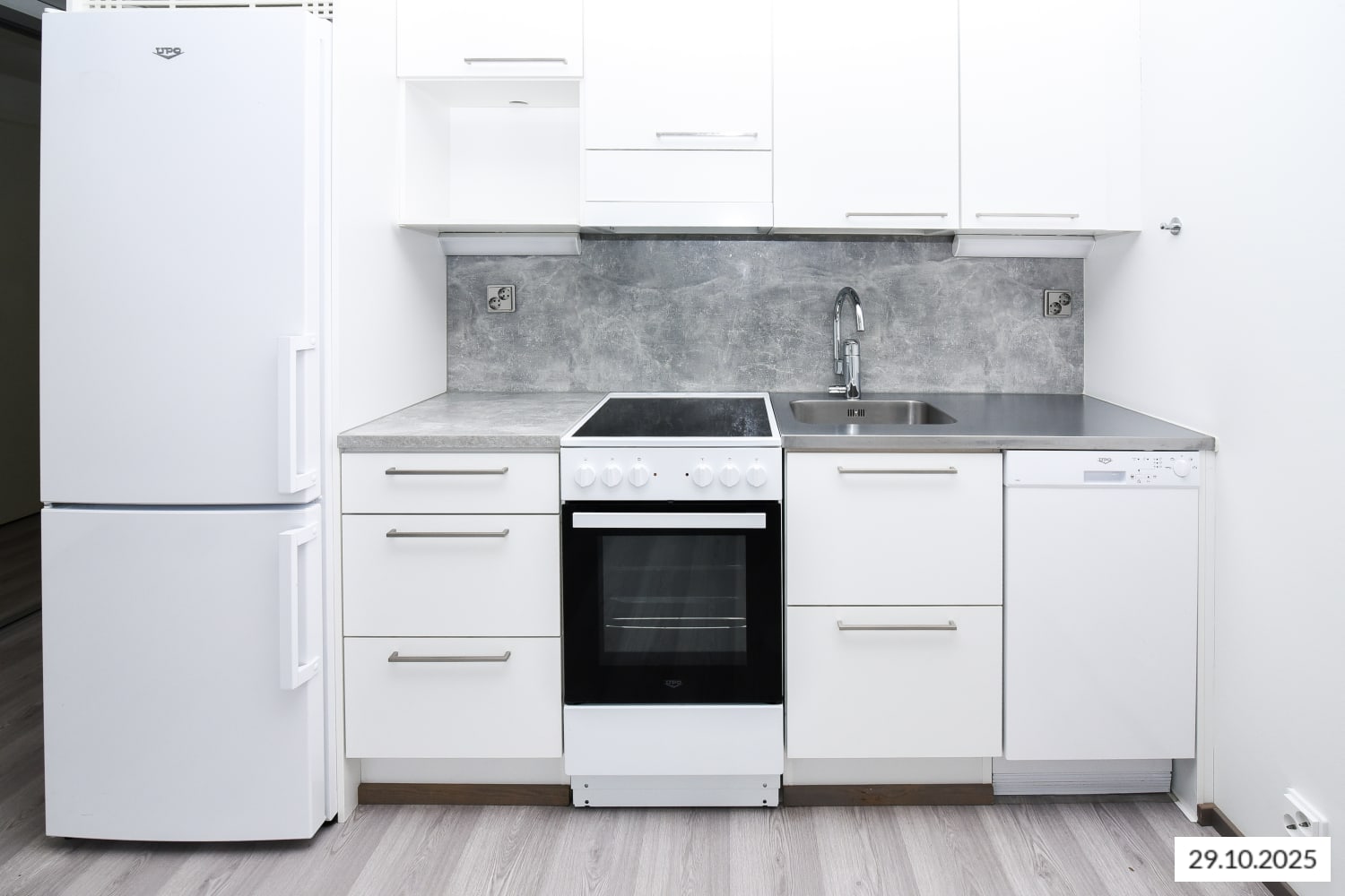 The kitchen features white cabinets and a movable island, which you can position to perfectly suit your interior design. The space between the upper and lower cabinets, along with the worktop, is grey laminate. The kitchen is equipped with a dishwasher, ceramic hob, and freezer-refrigerator.