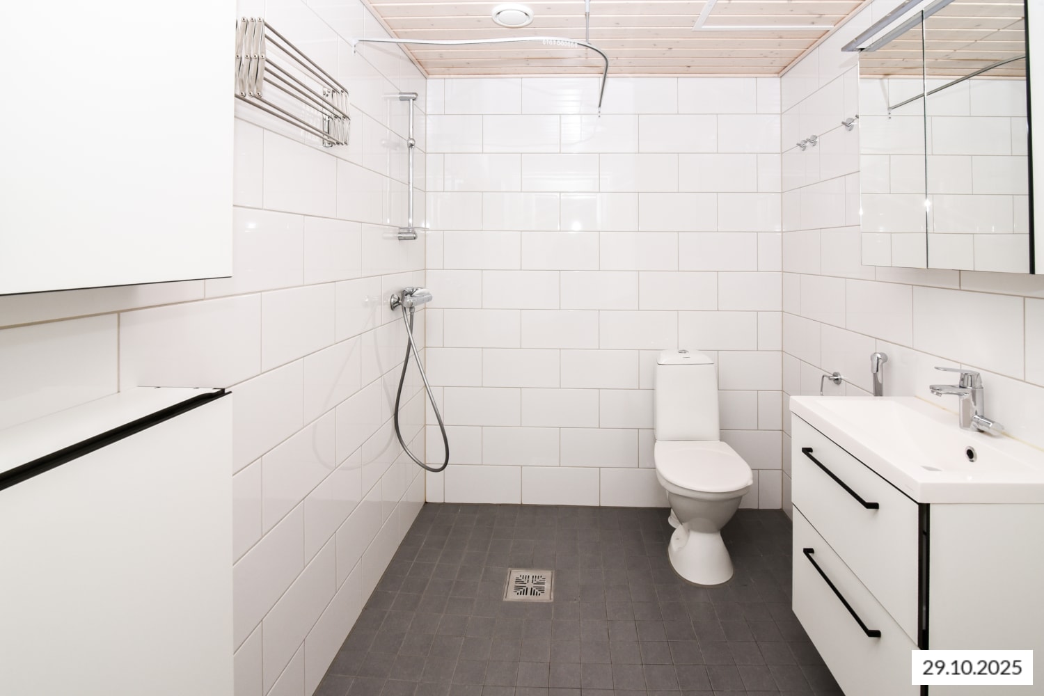 The bathroom boasts white furniture from SATO's Kide collection. The walls are adorned with large white tiles, and the floor is grey. There is space for a washing machine and tumble dryer, and a foldable drying rack is ready on the wall. The hallway closet has mirror sliding doors.