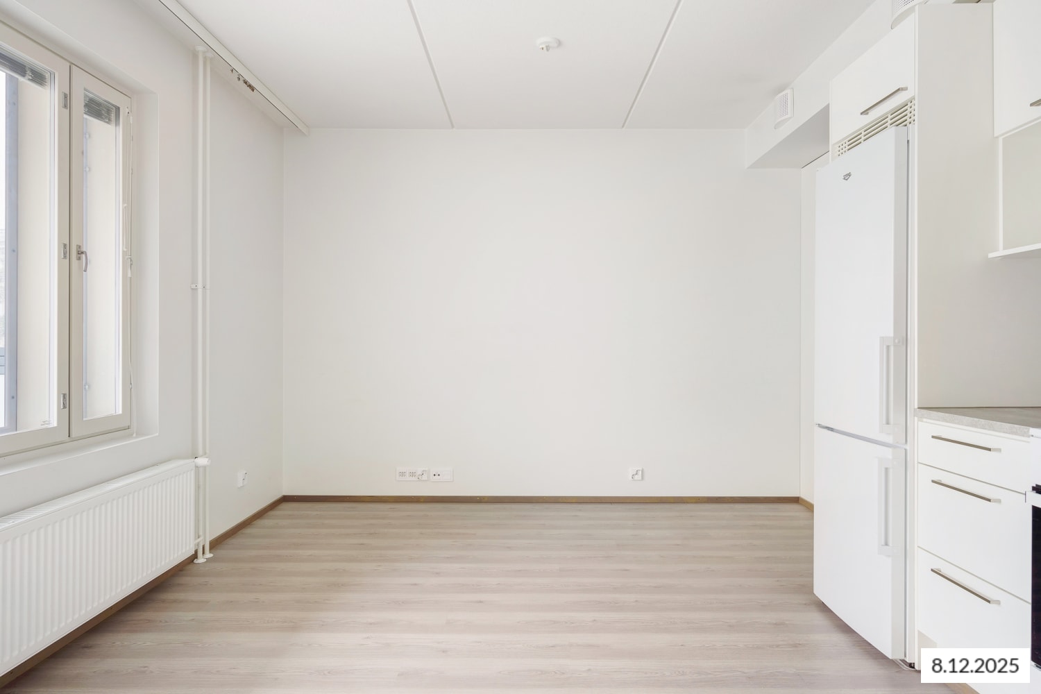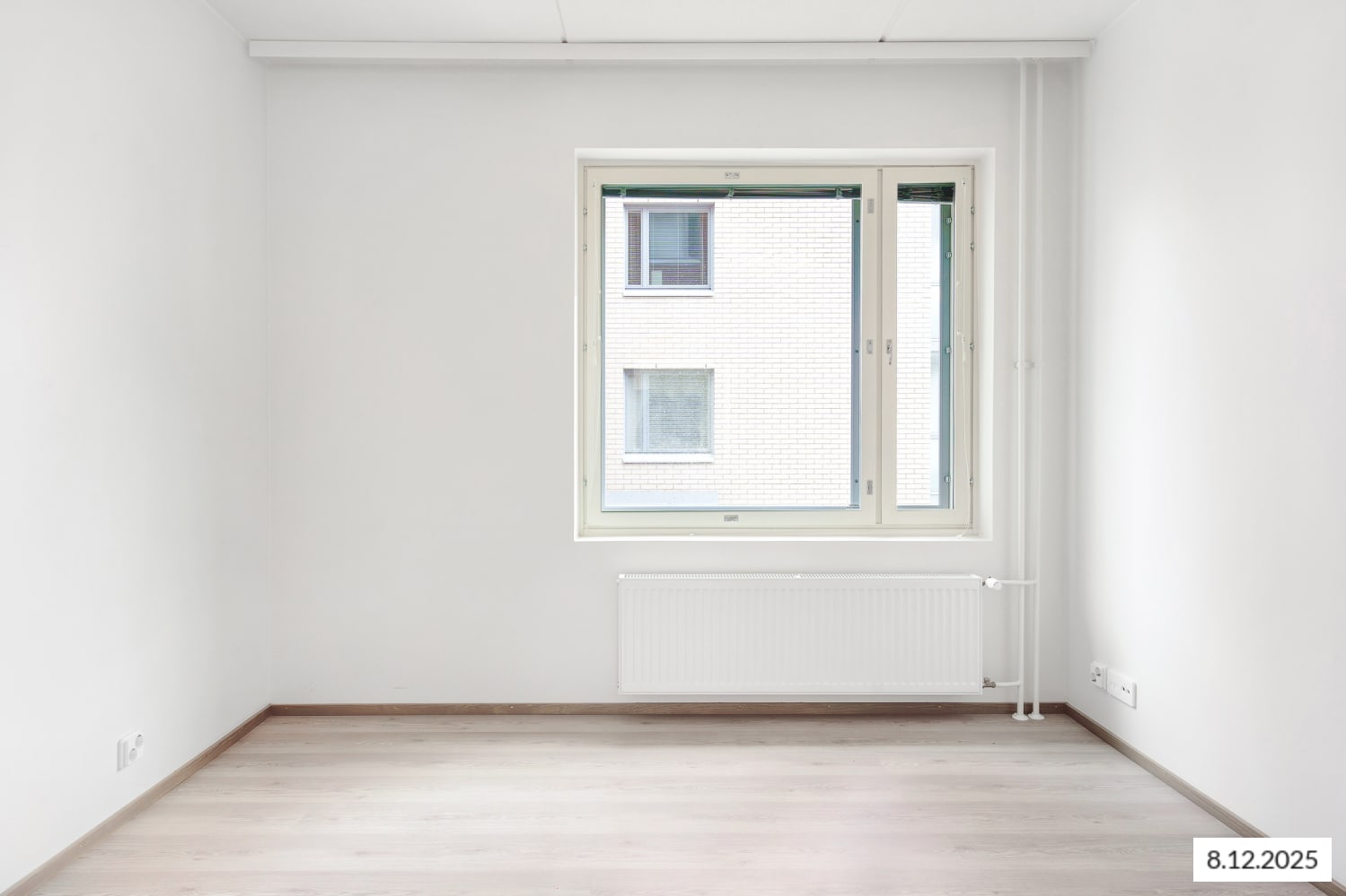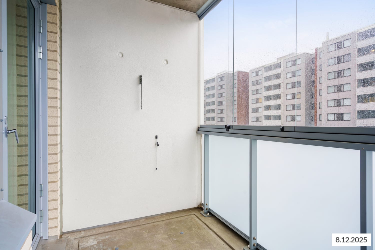 This bright 2-bedroom home feels more spacious than its square footage suggests, thanks to its clear spatial design, making it easy to decorate according to your personal style. The glazed balcony offers additional space for relaxation and is a lovely spot to enjoy summer morning coffee. The home's flooring is light oak laminate and the walls are painted white. The windows come with ready-installed venetian blinds. The kitchen features white cabinetry and a movable island, which you can position to suit your interior design. The space between the upper and lower cabinets and the worktop is grey laminate. The kitchen is equipped with a dishwasher, ceramic hob, and freezer-refrigerator. The bathroom has white, domestic Kide-series furniture. The walls are covered with large white tiles and the floor is grey. There is space for a washing machine and dryer, and a foldable drying rack is installed on the wall. The larger bedroom and the hallway have wardrobes with mirrored sliding doors.