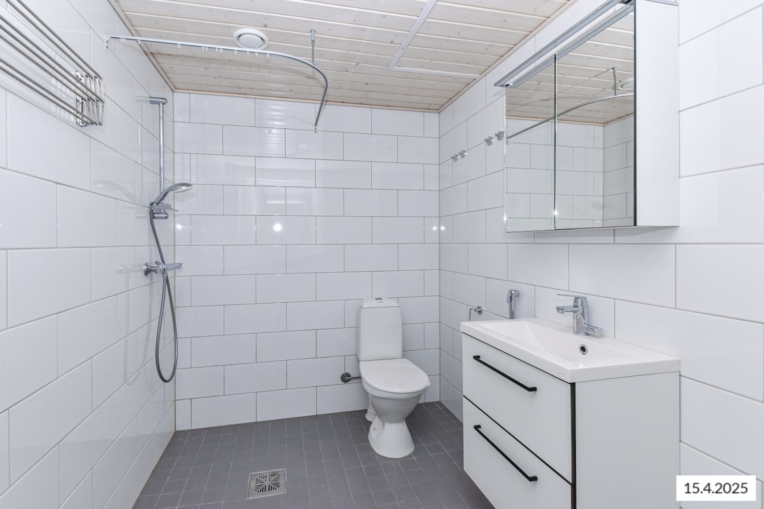 The bathroom is equipped with white domestic Kide collection furnishings. The walls are large white tiles and the floor is grey. There's space for a washing machine and tumble dryer, and a foldable drying rack is ready on the wall. The hallway cabinet has mirrored sliding doors.