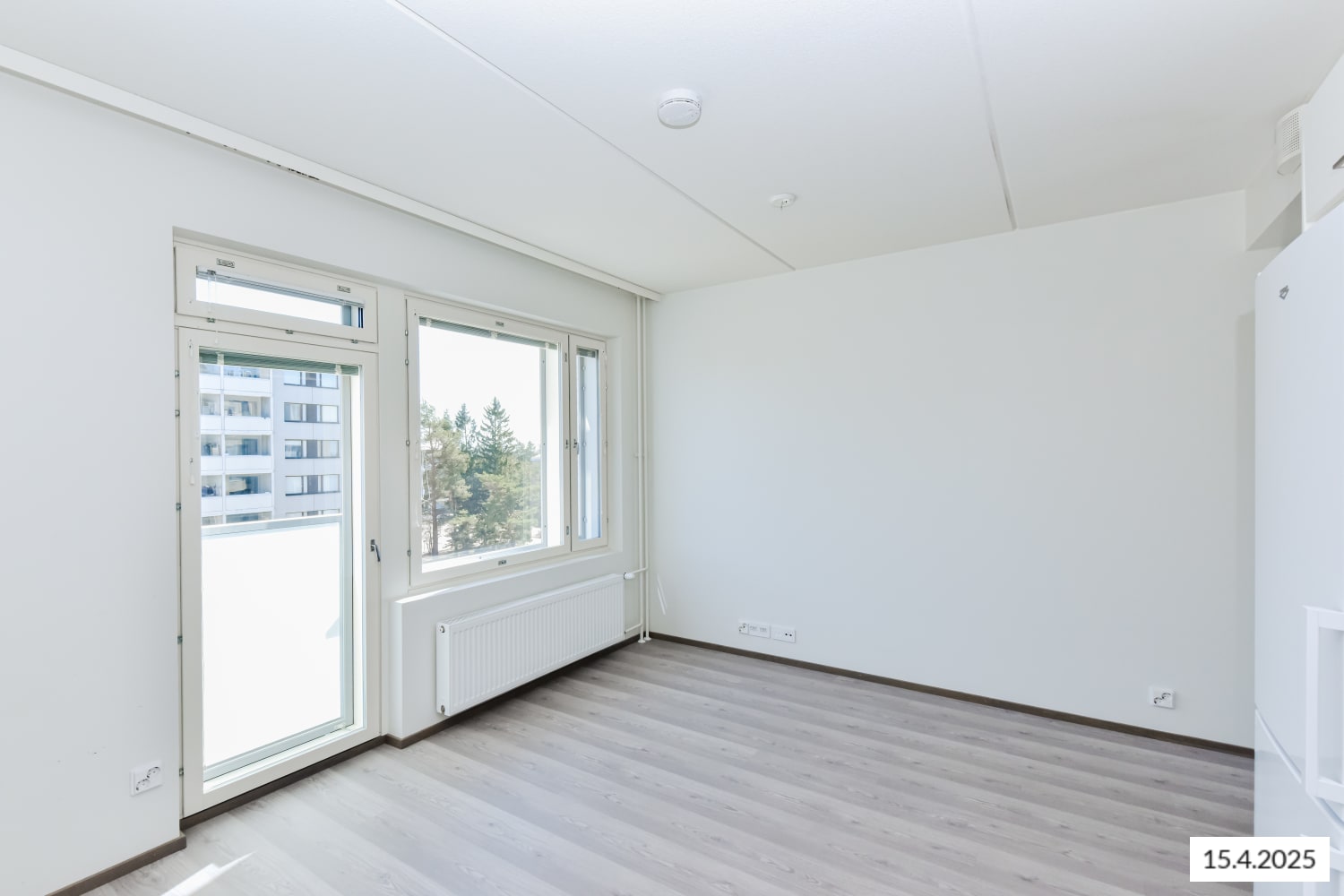 The studio home captivates with its open clarity, enhanced by the juliet balcony bringing light and airiness. The home's flooring is light oak laminate and the walls are painted white. The window is fitted with blinds.