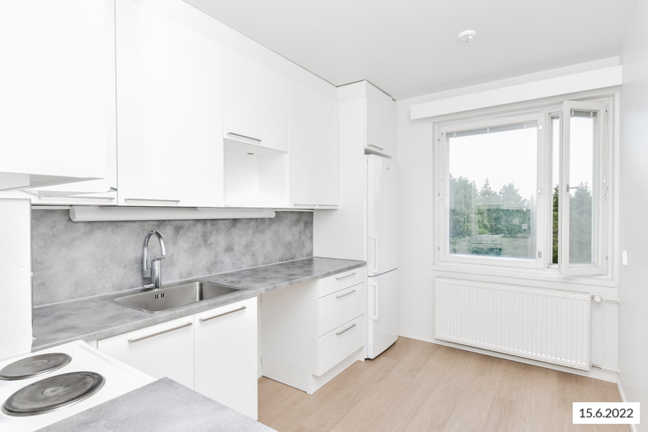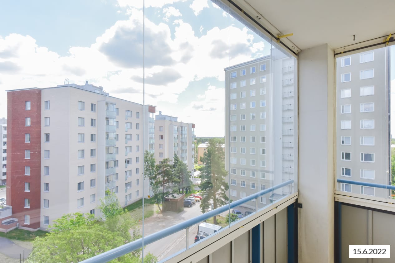 Except for the studios, all units have balconies wihtout glazing and the apartments on the higher floors offer stunning views across either Pirkkola sports park to the northeast or Pohjois-Haaga to the southwest. There are no glazings on the balconies, even though some of the older pictures might show otherwise.