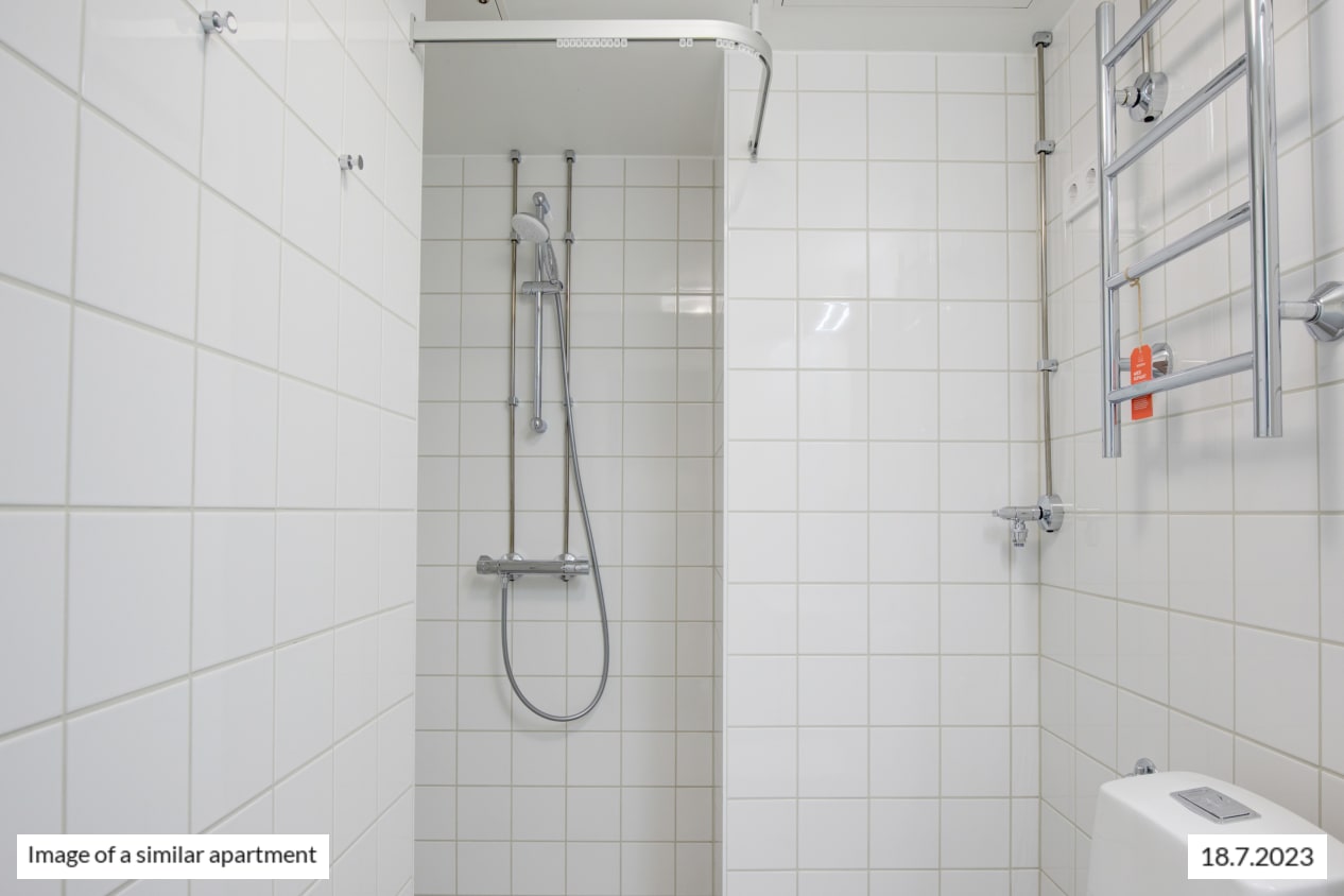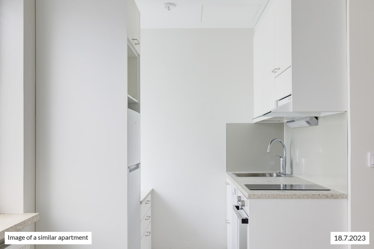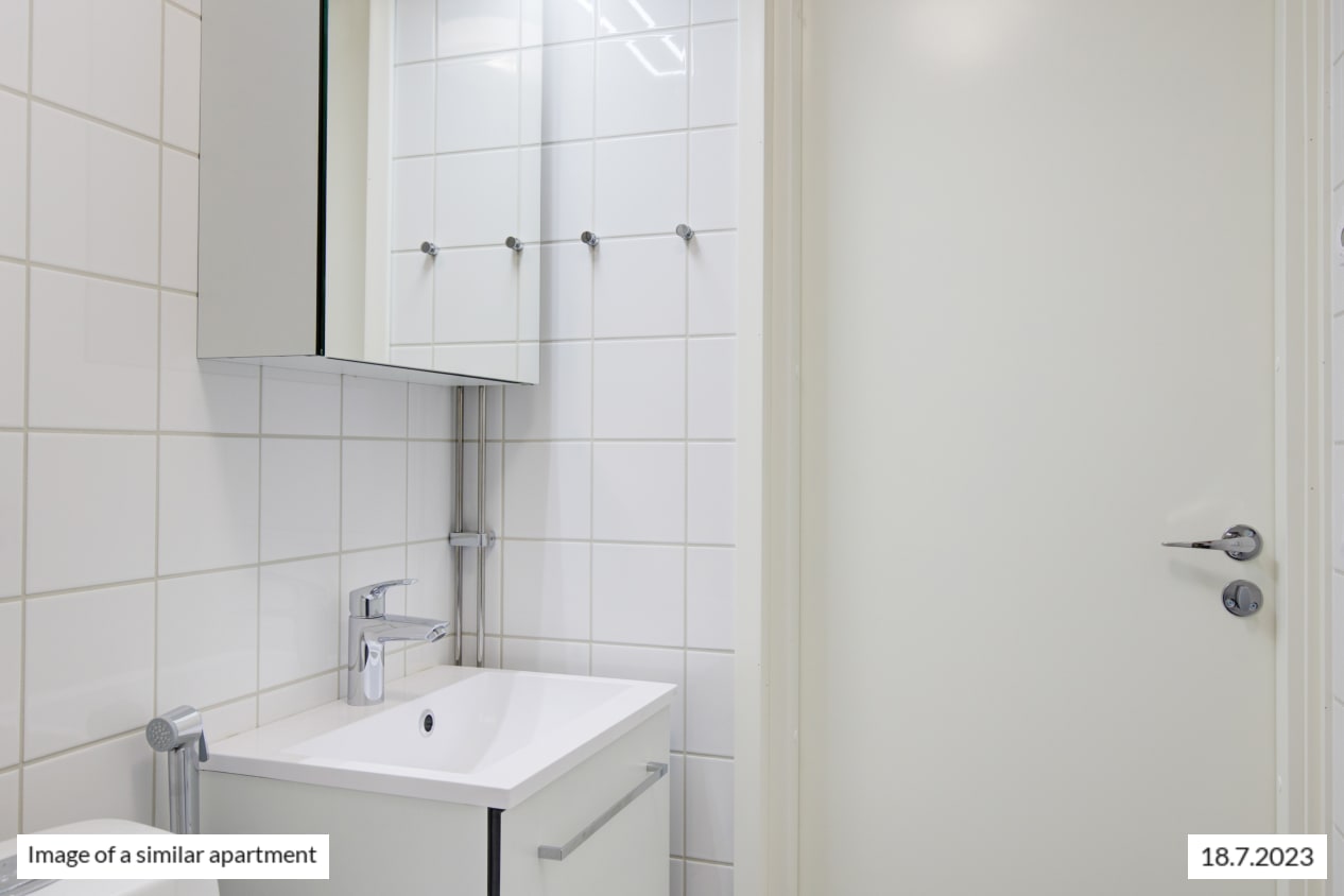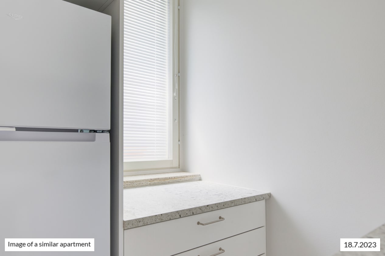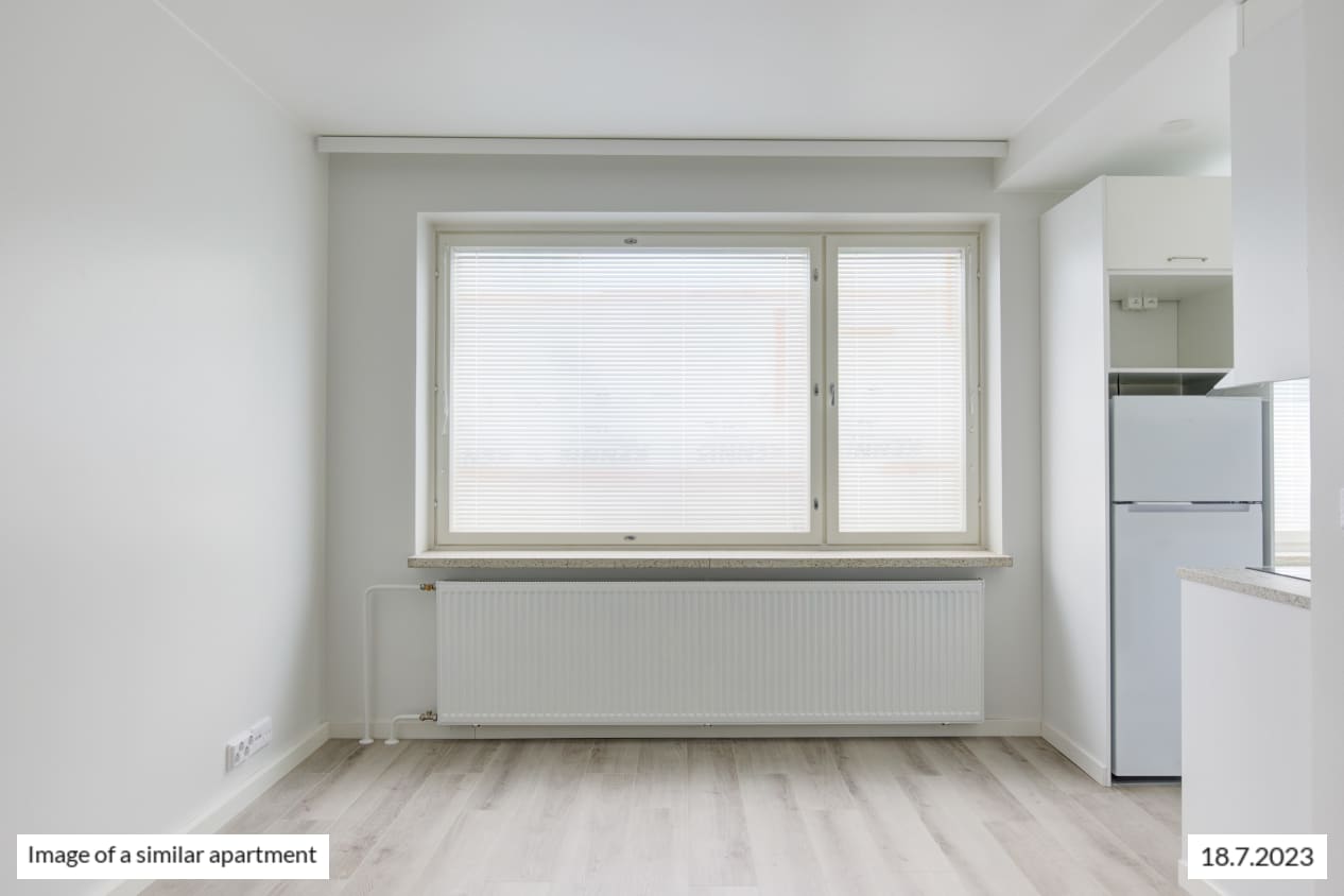 Light flows in through the wide window of the lounging area. There is room for plants as well as decorative items on the original windowsills. The lounging area features plenty of unbroken wall space enabling many different furniture setups. The handy alcove has a cabinet on the wall, and more wardrobe space can be found in the entrance hallway.