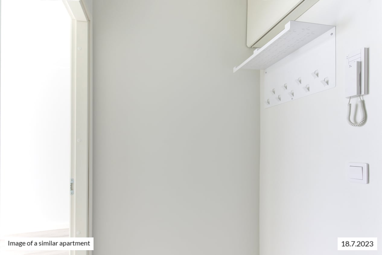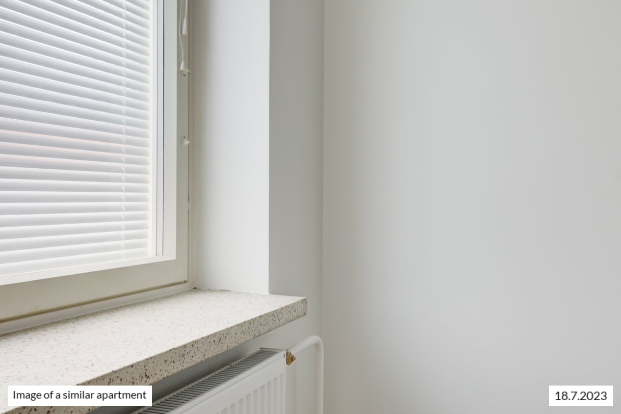 Light flows in through the wide window of the lounging area. There is room for plants as well as decorative items on the original windowsills. The lounging area features plenty of unbroken wall space enabling many different furniture setups. The handy alcove has a cabinet on the wall, and more wardrobe space can be found in the entrance hallway.