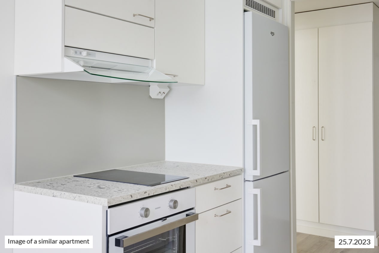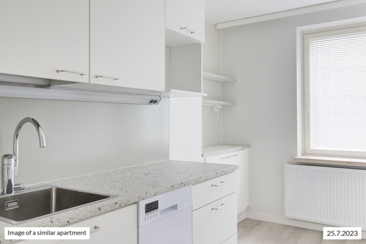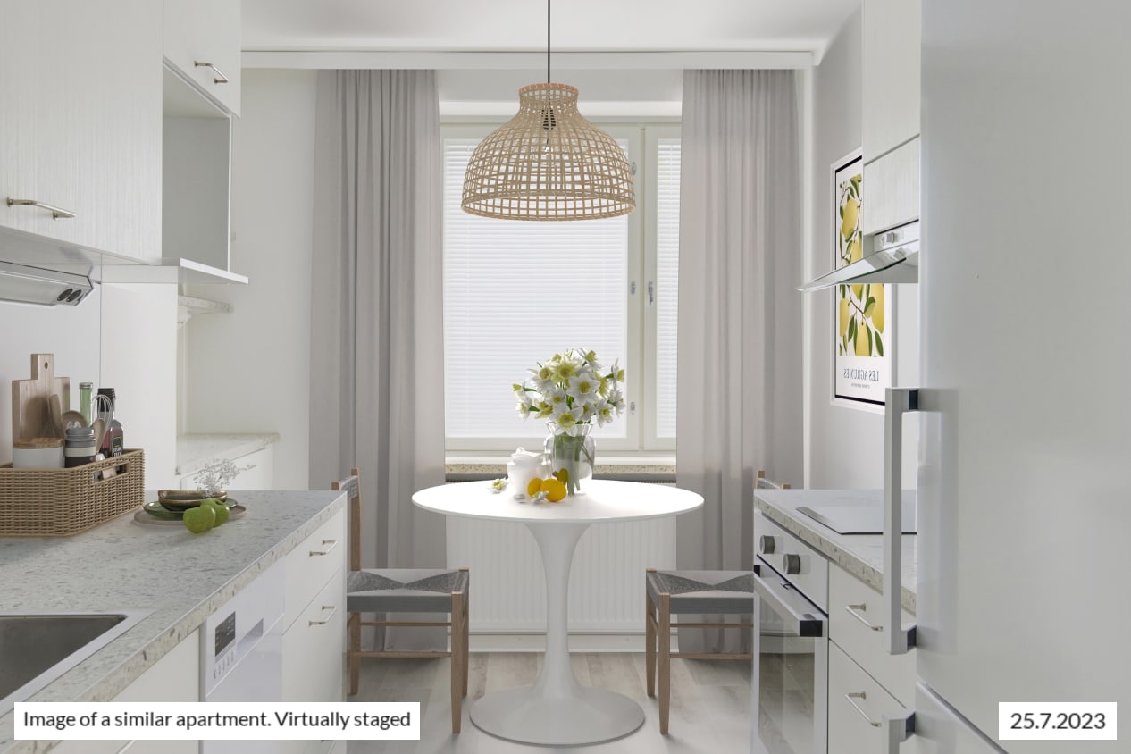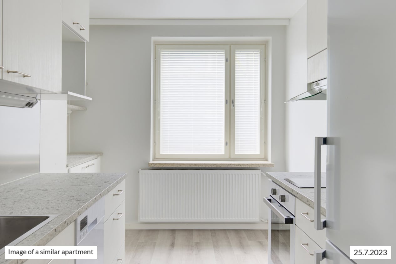 Fully renovated in 2023, the separate kitchen is compact and functional: the induction cooktop, oven and dishwasher make cooking a pleasure and there is a spot for a microwave, too. There is space for a small dining table in the kitchen, boasting a lovely view of the leafy landscape.