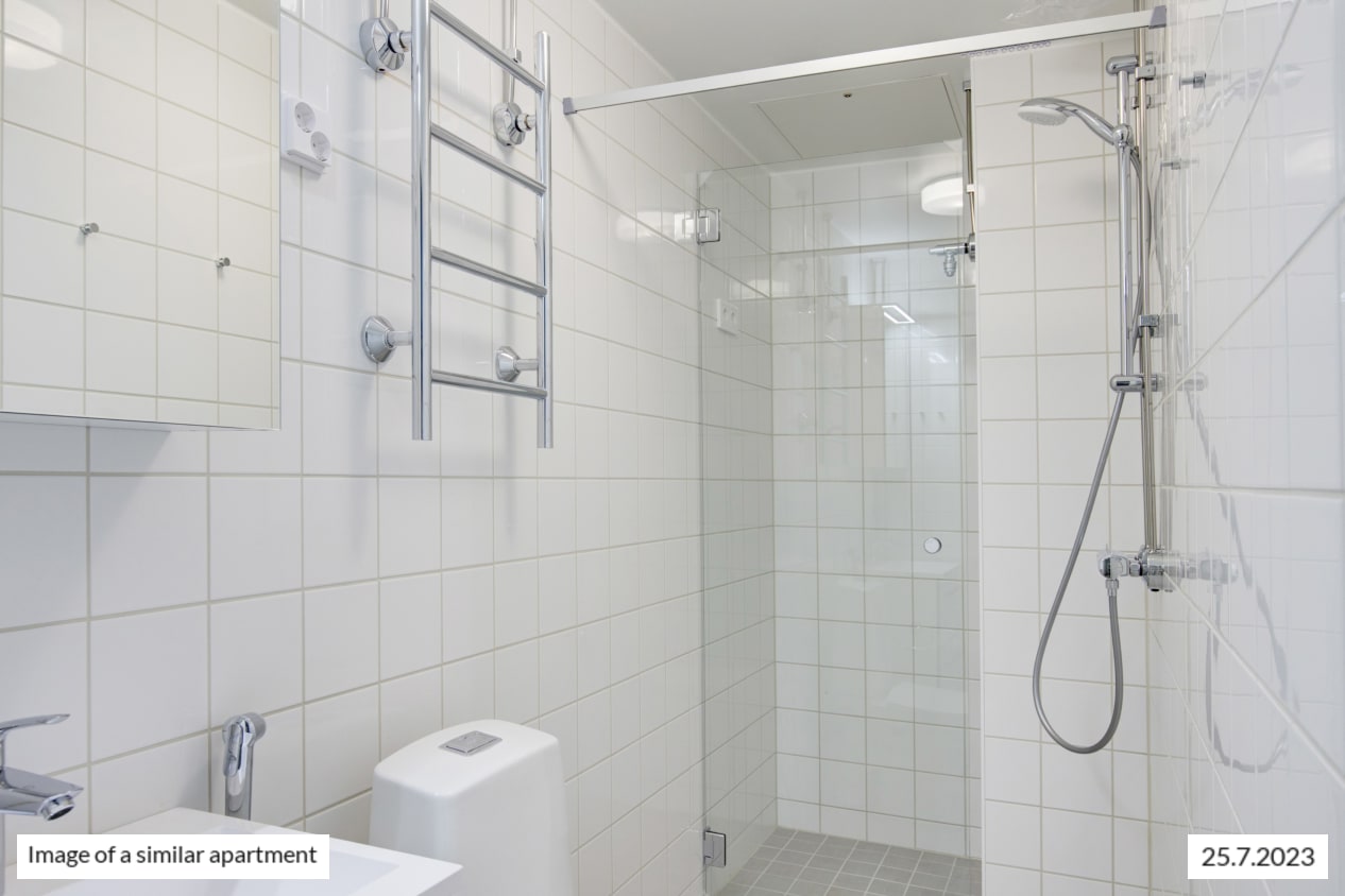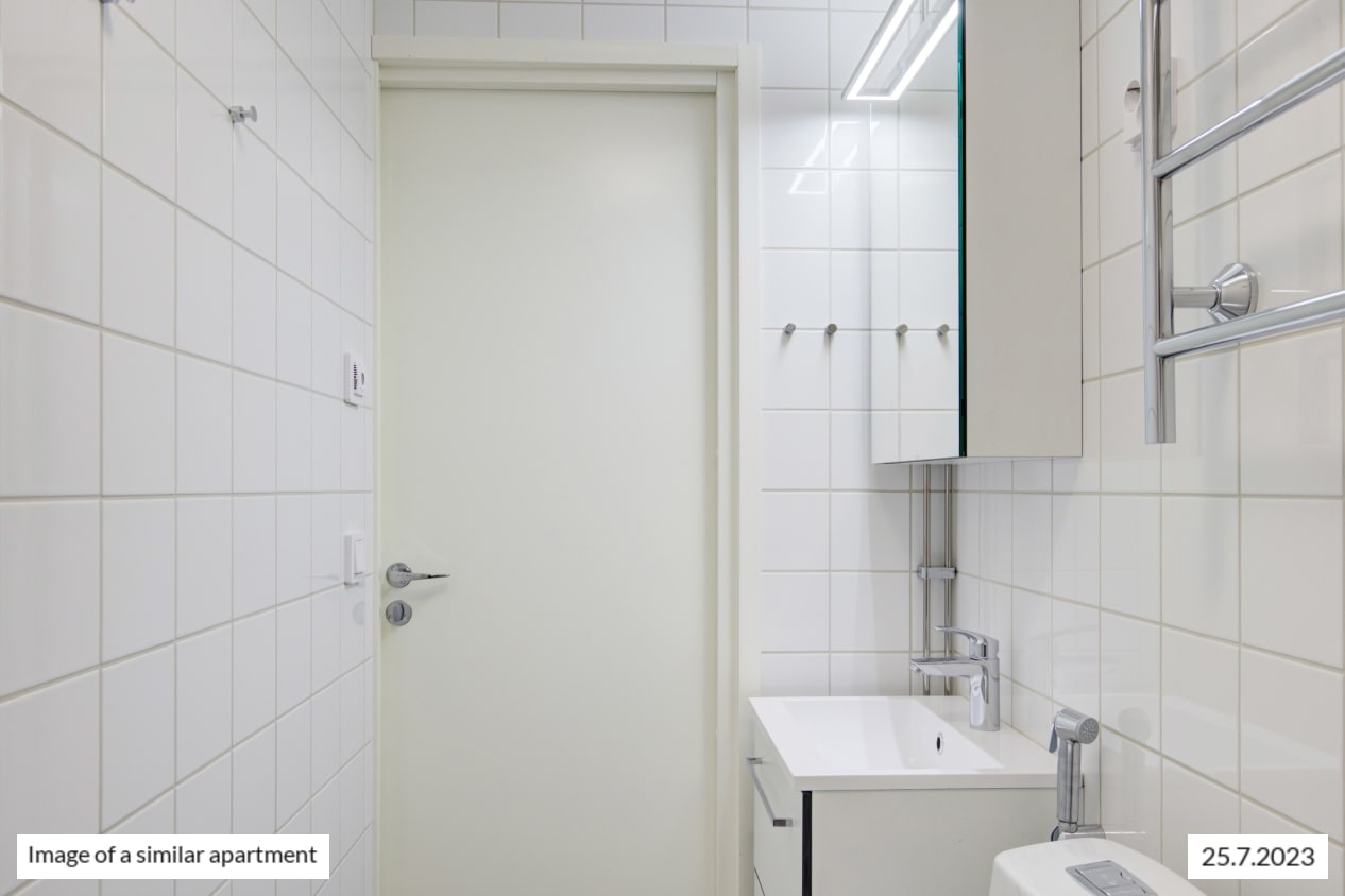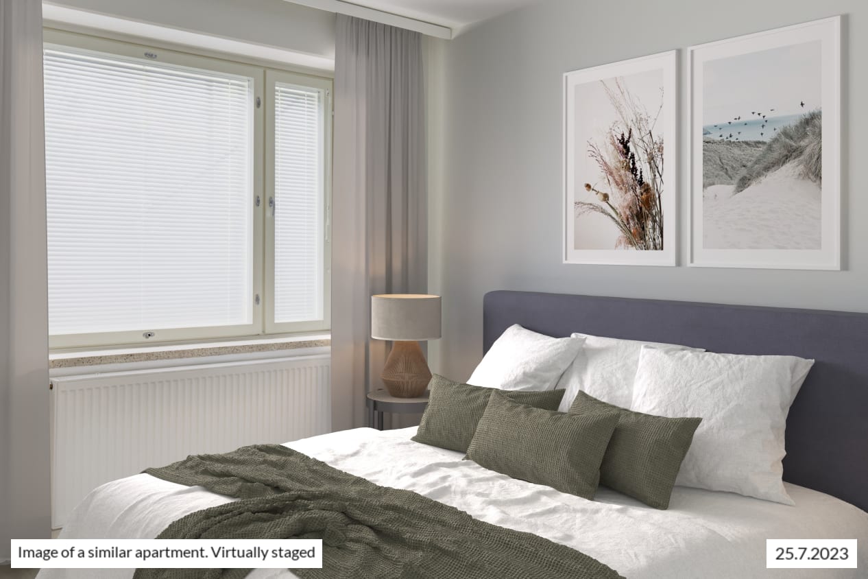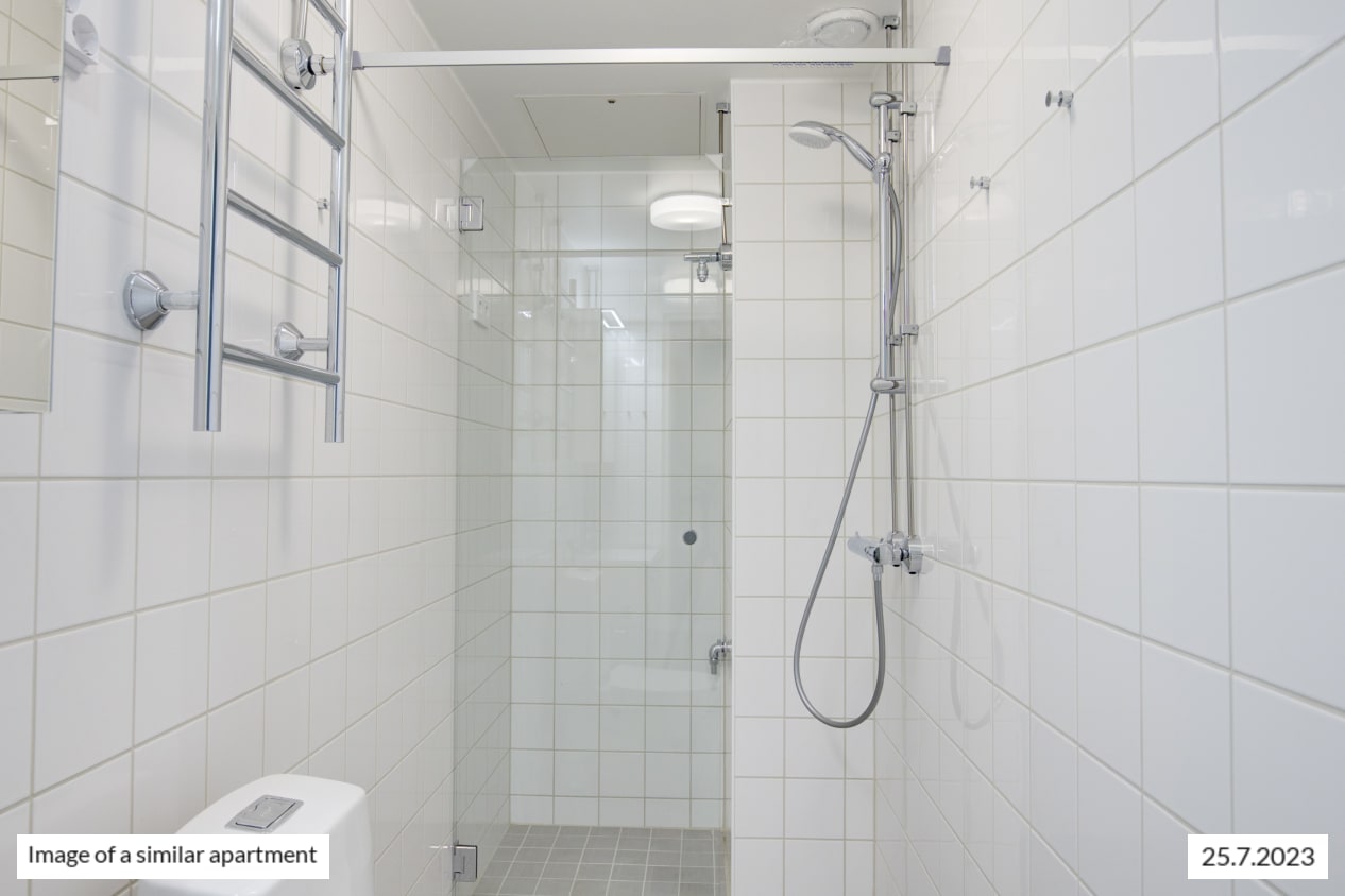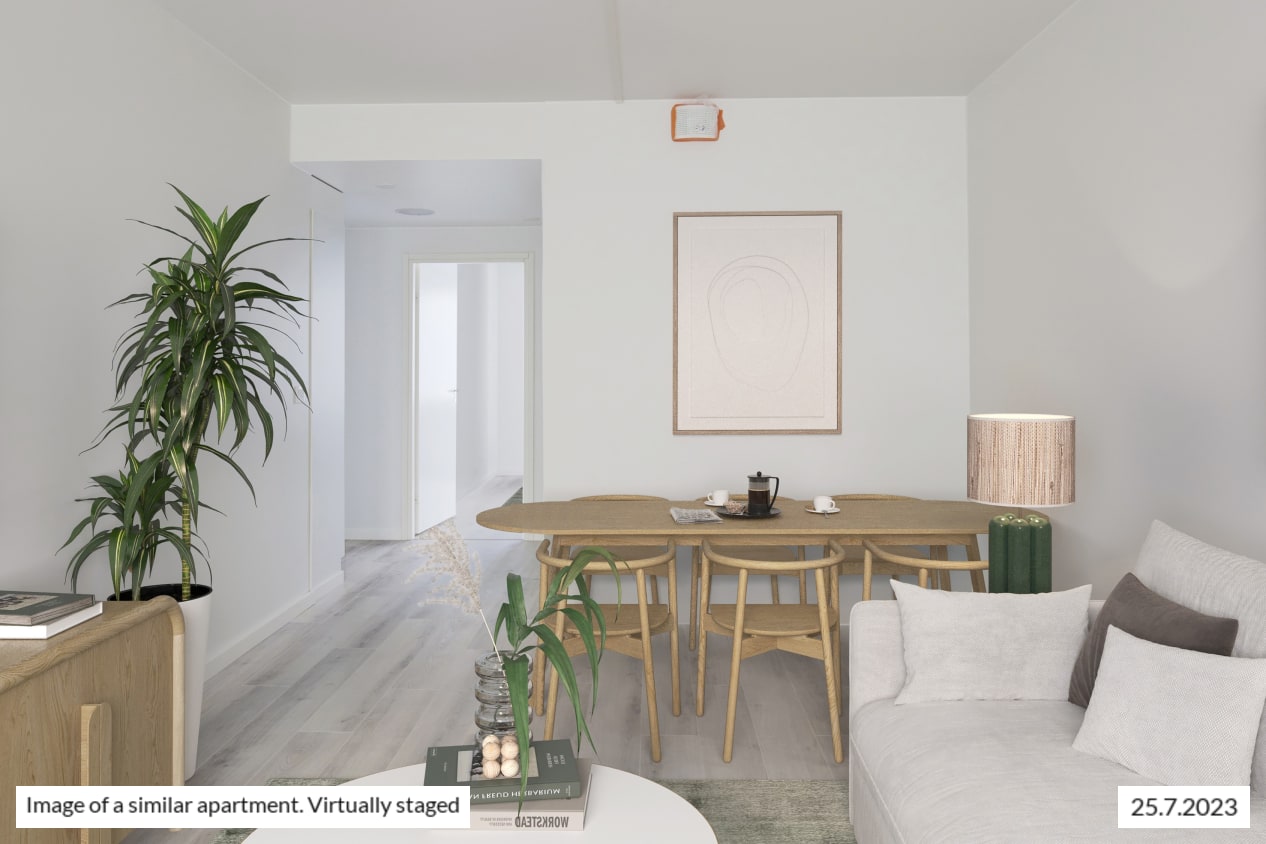 Light flows in through the wide window of the living room. The lounging area features plenty of unbroken wall space enabling many different furniture setups. Everyday luxury is provided by the spacious walk-in closet, with added storage found in the entrance hallway. Your own south-facing balcony is a lovely spot for perhaps a cup of coffee in the morning.